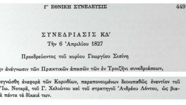 Στην ΚΔ συνεδρίαση της 6ης Απριλίου 1827 διαβάστηκε αναφορά των Κορίνθιων που παραπονούνται για τη συμπεριφορά των κ.κ. Ιωάννη Νοταρά, Γ.Χελιώτου και Ανδρέα Λόντου.