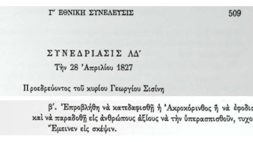 Στη ΛΔ΄ Συνεδρίαση της 28ης Απριλίου 1827 προτάθηκε η κατεδάφιση της Ακροκορίνθου ή ο να παραδοθεί σε ανθρώπους άξιους να την υπερασπιστούν.