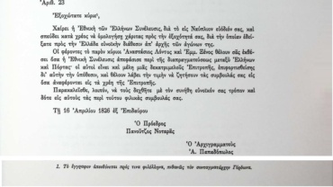 Το υπ΄άριθ.23 έγγραφο της 16ης Απριλίου 1826 απευθύνεται πιθανότατα προς τον φιλέλληνα Τόμας Γκόρντον ζητώντας του συμβουλές σε σχέση με τη διαπραγμάτευση του Ελληνικού Κράτους με τους Οθωμανούς για τον επιδιωκόμενο συμβιβασμό.