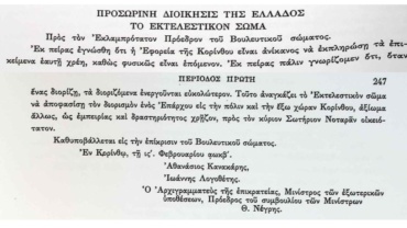 Στην επιστολή της 16ης Φεβρουαρίου 1822 το Εκτελεστικό αποφασίζει το διορισμό του Σωτηρίου Νοταρά ως Επάρχου στην πόλη και στην έξω χώρα της Κορίνθου.