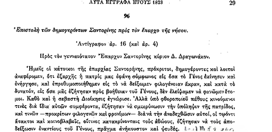 Οι δημογέροντες της Σαντορίνης αποστέλλουν επιστολή προς τον έπαρχο του νησιού κ. Δ. Δραγονάκο, τονίζοντας τη συμμετοχή της νήσου στην Επανάσταση. Παράλληλα εξαίρουν το ήθος, τα γενναία φρονήματα και τη φιλοπατρία κάποιων συμπολιτών τους οι οποίοι συκοφαντήθηκαν και μέσω παρούσας επιστολής αποβλέπουν στην αποκατάσταση της αλήθειας και στην απονομή δικαιοσύνης.