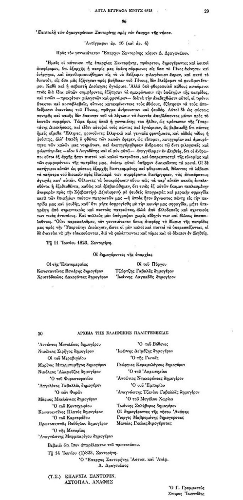 ΑΡΧΕΙΑ ΕΛΛΗΝΙΚΗΣ ΠΑΛΙΓΓΕΝΕΣΙΑΣ-17-11 Ιουνίου 1823- Επιστολή των δημογερόντων της Σαντορίνης προς τον έπαρχο της νήσου