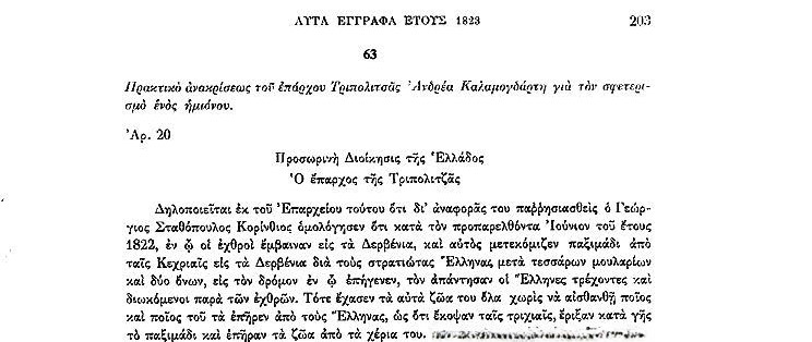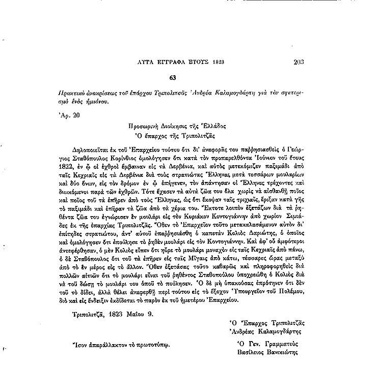 ΑΡΧΕΙΟ ΕΛΛΗΝΙΚΗΣ ΠΑΛΙΓΓΕΝΕΣΙΑΣ-16-9 Μαίου 1823-Πρακτικό ανακρίσεως του επάρχου Τριπολιτσάς Ανδρέα Καλαμογδάρτη για τον σφετερισμό ενός ημιόνου Ο έπαρχος Τριπολιτσάς Ανδρέας Καλαμογδάρτης συντάσσει πρακτικό σχετικά με την απώλεια και το σφετερισμό ζώου . ΑρκαδίαΒουλευτικό ΣώμαΓεώργιος ΣταθόπουλοςΔερβένιαΕκτελεστικό ΣώμαΕλλάδαΕπαρχίεςΈπαρχοςΈπαρχος ΤρίποληςΖώαΚαπετάν Κολιός ΔαριώτηςΚεχριέςΚυριάκος ΚοντογιάννηςΠελοπόννησοςΤρίποληΥπουργείο Πολέμου