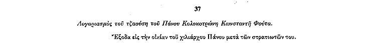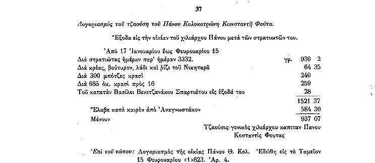 ΑΡΧΕΙΑ ΕΛΛΗΝΙΚΗΣ ΠΑΛΙΓΓΕΝΕΣΙΑΣ-16-15 Φεβρουαρίου 1823-Λογαριασμός του τζαούση του Πάνου Θ. Κολοκοτρώνη, Κωνσταντή Φούτα Το παρόν έγγραφο αποτελεί το λογαριασμό εξόδων της οικίας και των στρατιωτών του χιλιάρχου Πάνου Θ. Κολοκοτρώνη Βουλευτικό ΣώμαΕκτελεστικό ΣώμαΕλλάδαΚαπετάν Βασίλης ΒενετζανάκοςΚωνσταντής ΦούταςΛογαριασμόςΟκάΠάνος Θ. ΚολοκοτρώνηςΣτρατός-Στρατιώτες