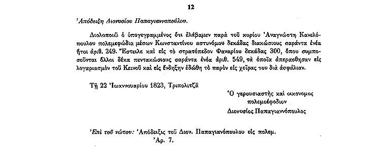 ΑΡΧΕΙΑ ΕΛΛΗΝΙΚΗΣ ΠΕΛΙΓΓΕΝΕΣΙΑΣ-16-22 Ιανουαρίου 1823-Απόδειξη Διονυσίου Παπαγιαννόπουλου Το παρόν έγγραφο αποτελεί απόδειξη για την παραλαβή πολεμοφοδίων. ΑρκαδίαΒουλευτικό ΣώμαΔιονύσιος ΠαπαγιαννόπουλοςΕκτελεστικό ΣώμαΕλλάδαΠελοπόννησοςΠολεμοφόδιαΤρίπολη