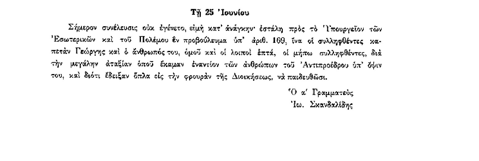 Την 25η Ιουνίου 1823 εστάλη προβούλευμα προς τα Υπουργεία Εσωτερικών & Πολέμου σχετικά με επίθεση που έγινε στους ανθρώπους του Στρατηγού Θ. Κολοκοτρώνη.