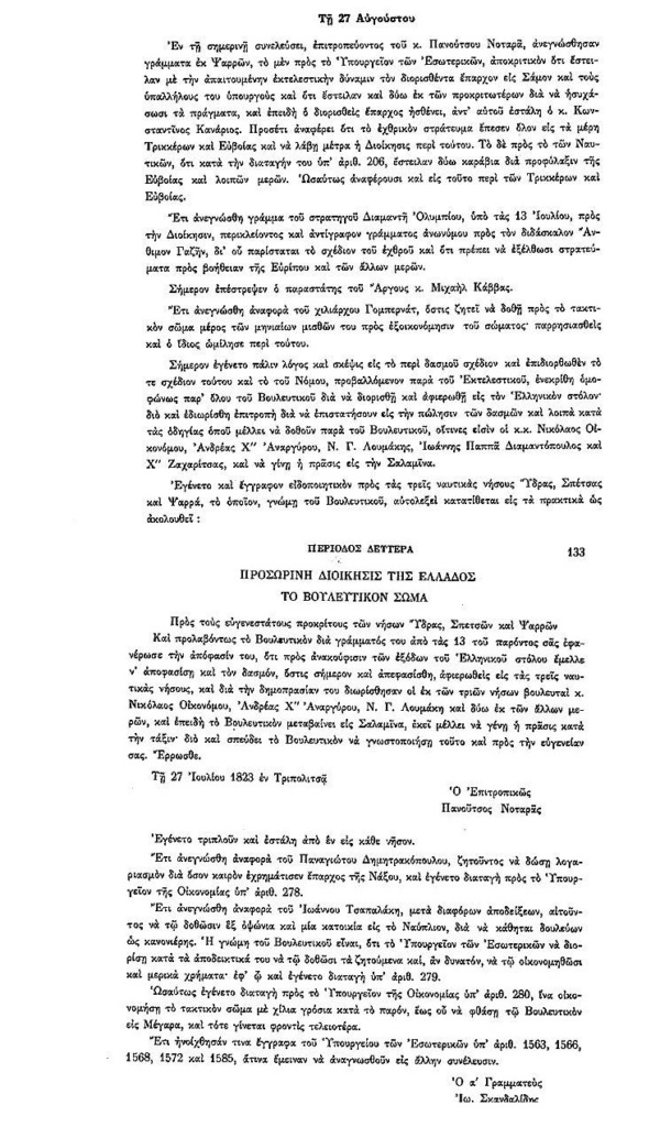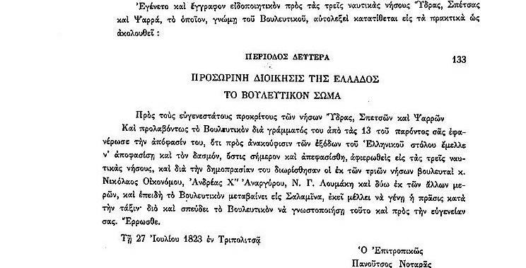 ΑΡΧΕΙΑ ΕΛΛΗΝΙΚΗΣ ΠΑΛΙΓΓΕΝΕΣΙΑΣ-2-27 Ιουλίου 1823, παρ.5 Στη συνέλευση της 27ης Αυγούστου 1823 ενεκρίθη το σχέδιο περί δασμών και αποφασίσθηκε να δοθούν τα ποσά για τον ελληνικό στόλο. Ανδρέας ΑναργύρουΒουλευτικό ΣώμαΓρόσιαΔασμοίΕκτελεστικό ΣώμαΕλλάδαΖαχαρίτζαςΙω.Παππά ΔιαμαντόπουλοςΝικολ.ΟικονόμοςΝικόλαος ΛουμάκηςΠανούτσος ΝοταράςΣαλαμίναΣπέτσεςΎδραΨαρρά