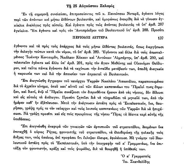 ΑΡΧΕΙΑ ΕΛΛΗΝΙΚΗΣ ΠΑΛΙΓΓΕΝΕΣΙΑΣ-2-25 Αυγούστου 1823,παρ.2 Στη συνέλευση της 25ης Αυγούστου διαβάστηκε έγγραφο του Ναυάρχου Ψαρρών περί μη απόδοσις του μεριδίου από τον έρανο στα νησιά. Βουλευτικό ΣώμαΕκτελεστικό ΣώμαΕλλάδαΙω.ΣκανδαλίδηςΝησιάΝικόλαος ΑποστόλουΠανούτσος ΝοταράςΎδραΨαρρά