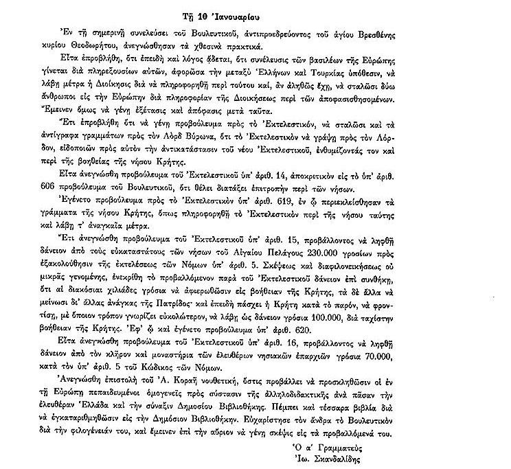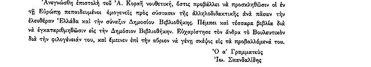 ΑΡΧΕΙΑ ΕΛΛΗΝΙΚΗΣ ΠΑΛΙΓΓΕΝΕΣΙΑΣ-2-10 Ιανουαρίου 1824, παρ.8 Στη συνέλευση της 10ης Ιανουαρίου 1824 διαβάστηκε επιστολή του Αδαμάντιου Κοραή ο οποίος καλεί τους Έλληνες ομογενείς να συνεισφέρουν στη δημιουργία Δημόσιας Βιβλιοθήκης. Αδαμάντιος ΚοραήςΒουλευτικό ΣώμαΔημόσια ΒιβλιοθήκηΕκτελεστικό ΣώμαΕλλάδαΕυρώπηΙω.Σκανδαλίδης