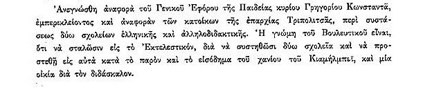 Στη συνέλευση της 24ης Σεπτεμβρίου 1824 διαβάστηκε αναφορά του Γενικού Εφόρου της Παιδείας σχετικά με τη σύσταση δύο σχολείων ελληνικής και αλληλοδιδακτικής.