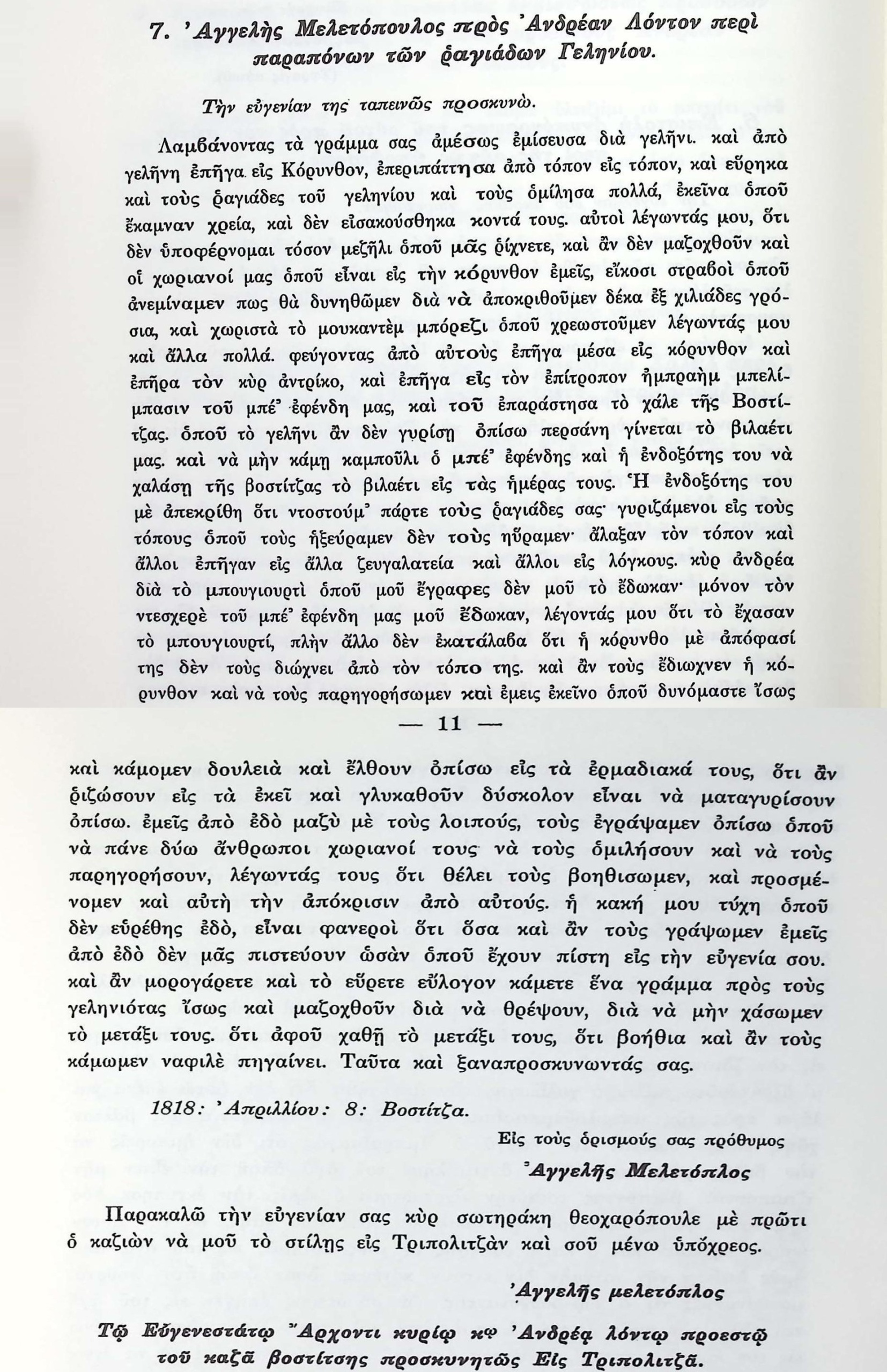 ΙΣΤΟΡΙΚΟΝ ΑΡΧΕΙΟΝ ΤΟΥ ΣΤΡΑΤΗΓΟΥ ΑΝΔΡΕΟΥ ΛΟΝΤΟΥ (1789-1847), τόμος Α’-άρθρο 7 Στο παρόν άρθρο περιγράφονται οι προσπάθειες για να επιστρέψουν οι ραγιάδες του Γεληνίου στον τόπο τους και να μείνουν στην Κόρινθο και στα γύρω χωριά. Αγγελής ΜελετόπουλοςΒοστίτσα-ΑίγιοΓελήνιΓρόσιαΕλλάδαΚορινθίαΚόρινθοςΠελοπόννησοςΣτρατηγός Ανδρέας ΛόντοςΤρίπολη