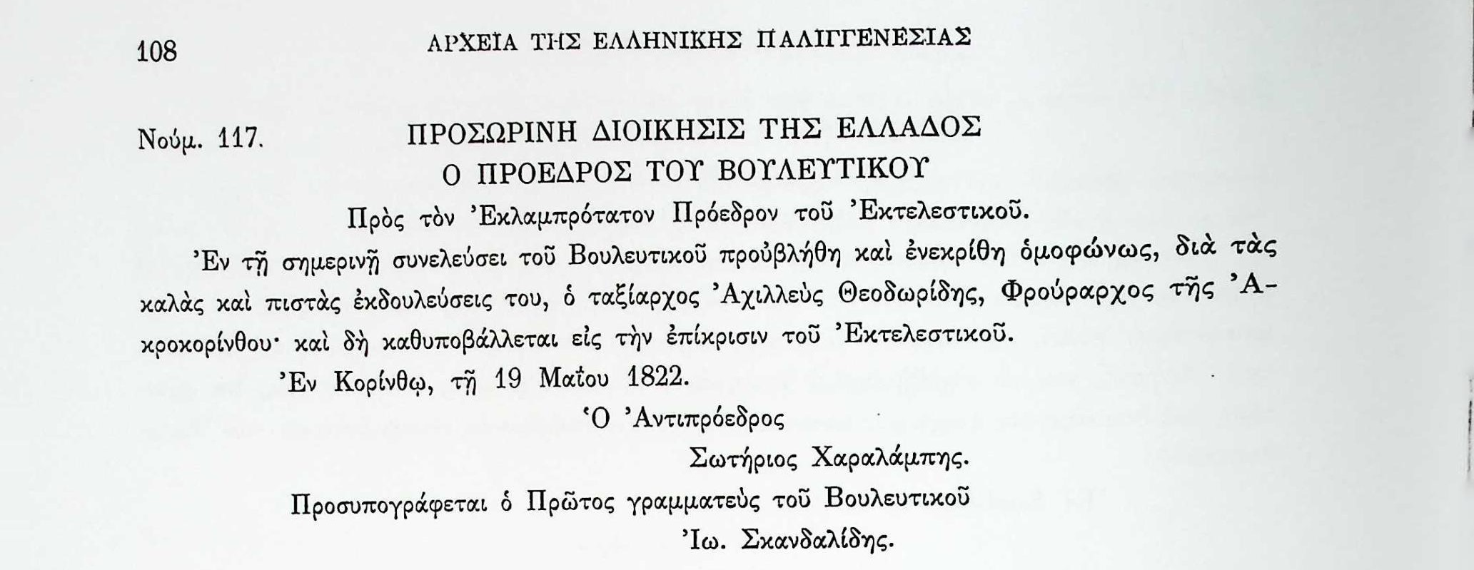 ΑΡΧΕΙΑ ΕΛΛΗΝΙΚΗΣ ΠΑΛΙΓΓΕΝΕΣΙΑΣ-1-19 Μαΐου 1822 Στο πρ.117 του Βουλευτικού εγκρίθηκε ο Φρούραρχος της Κορίνθου, Αχιλλέας Θεοδωρίδης. ΑκροκόρινθοςΑχιλλέας ΘεοδωρίδηςΒουλευτικό ΣώμαΕκτελεστικό ΣώμαΕλλάδαΙω.ΣκανδαλίδηςΚορινθίαΚόρινθοςΠελοπόννησοςΣ.ΧαραλάμπηςΦρούραρχοςΦρούραρχος Κορίνθου