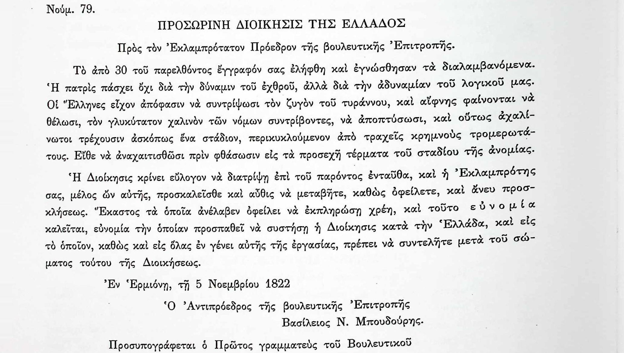 Στην υπ’αριθμ. 79 Επιστολή του Βουλευτικού προς τον Πρόεδρο της Βουλευτικής Επιτροπής, γίνεται ενημέρωση σχετικά με την αδυναμία που επιδεικνύουν οι Έλληνες απέναντι στον εχθρό και τις απαιτούμενες ενέργειες.