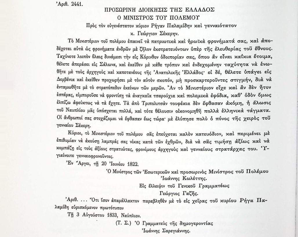 ΑΡΧΕΙΑ ΕΛΛΗΝΙΚΗΣ ΠΑΛΙΓΓΕΝΕΣΙΑΣ-1-Υπ. Εσωτερικών προς διάφορους Η υπ’αρίθμ. 2441 επιστολή του Υπ. Πολέμου αφορά τη μετάβαση στρατευμάτων στα Σάλωνα μέσω της Κορίνθου. ΑρκαδίαΓ.ΣέκερηςΓεώργιος ΓαζήςΔερβένιαΙωάννης ΚωλέττηςΙωάννης ΣαρεγιάννηςΚορινθίαΚόρινθοςΝαύπλιοΟπλισμόςΠολεμοφόδιαΡήγας ΠαλαμίδηςΣάλωναΤρίποληΥπουργείο Πολέμου
