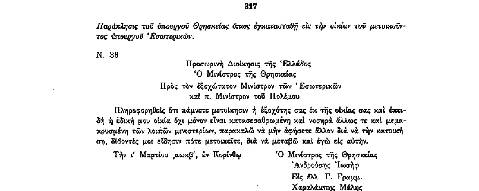 ΑΡΧΕΙΑ ΕΛΛΗΝΙΚΗΣ ΠΑΛΙΓΓΕΝΕΣΙΑΣ-14-Έγγραφα του Υπ. Θρησκείας Στην υπ΄αρίθμ. 36 επιστολή του Υπ. Θρησκείας ζητείται η μετοίκηση στην οικία του Υπ. Εσωτερικών λόγω μετακόμισης του τελευταίου από αυτήν. ΕλλάδαΙωσήφ ΑνδρούσηςΚορινθίαΚόρινθοςΠελοπόννησοςΥπουργείο ΕσωτερικώνΥπουργείο ΘρησκείαςΥπουργείο ΠολέμουΧαράλ. Μάλης