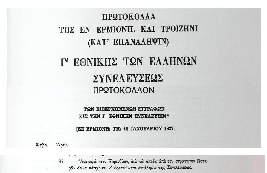 ΑΡΧΕΙΑ ΕΛΛΗΝΙΚΗΣ ΠΑΛΙΓΓΕΝΕΣΙΑΣ-3-Γ΄ Εθνοσυνέλευση-Πρωτόκολλα Α.Π. 97/Φεβρουαρίου 1827: αναφορά των Κορίνθιων σχετικά με την άσχημη συμπεριφορά του Στρατηγού Νοταρά. Αναστάσιος ΝοταράςΓεώργιος ΝοταράςΕλλάδαΚορινθίαΚόρινθοςΠανούτσος ΝοταράςΠελοπόννησοςΠρωτόκολλαΣπυρίδων ΝοταράςΣωτήριος Σπ.Νοταράς