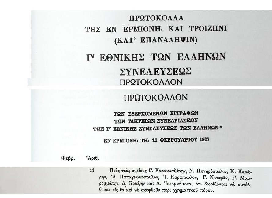 ΑΡΧΕΙΑ ΕΛΛΗΝΙΚΗΣ ΠΑΛΙΓΓΕΝΕΣΙΑΣ-3-Γ΄Εθνοσυνέλευση-Εξερχόμενα Πρωτόκολλα Α.Π.11/14 Φεβρουαρίου 1827: Ορισμός επιτροπής για εξεύρεση χρηματικών πόρων. Γεώργ.ΜαυρομμάτηςΓεώργιος ΝοταράςΓκίκας ΚαρακατσάνηςΔ.ΚριεζήςΔημάκης ΙερομνήμωνΔιονύσιος ΠαπαγιαννόπουλοςΕλλάδαΕρμιόνηΗλίας ΚαραπαύλοςΚωνσταντίνος ΚανάρηςΝικ.Πονηρόπουλος
