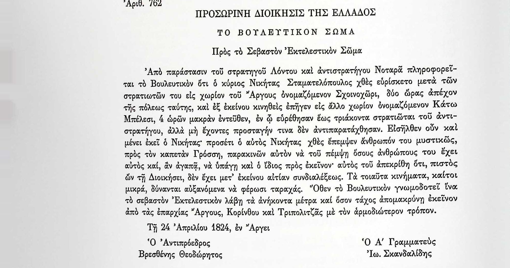 ΑΡΧΕΙΑ ΕΛΛΗΝΙΚΗΣ ΠΑΛΙΓΓΕΝΕΣΙΑΣ, τ.6,αρ.762 Β’ Βουλευτική Περίοδος- Προβουλεύματα & Λοιπά Έγγραφα Βουλευτικού Σώματος , αρ.762, σελ.88-Απομάκρυνση Νικηταρά από Επαρχίες Πελοποννήσου. Άγιος Βρεσθένης ΘεοδώρητοςΆργοςΒουλευτικό ΣώμαΕκτελεστικό ΣώμαΕλλάδαΕπαρχίεςΙω.ΣκανδαλίδηςΚαπετάν ΓρόσσηςΚάτω ΜπέλεσιΚόρινθοςΝικήτας ΣταματελόπουλοςΠροσωρινή ΔιοίκησηΣχοινοχώριΤρίπολη