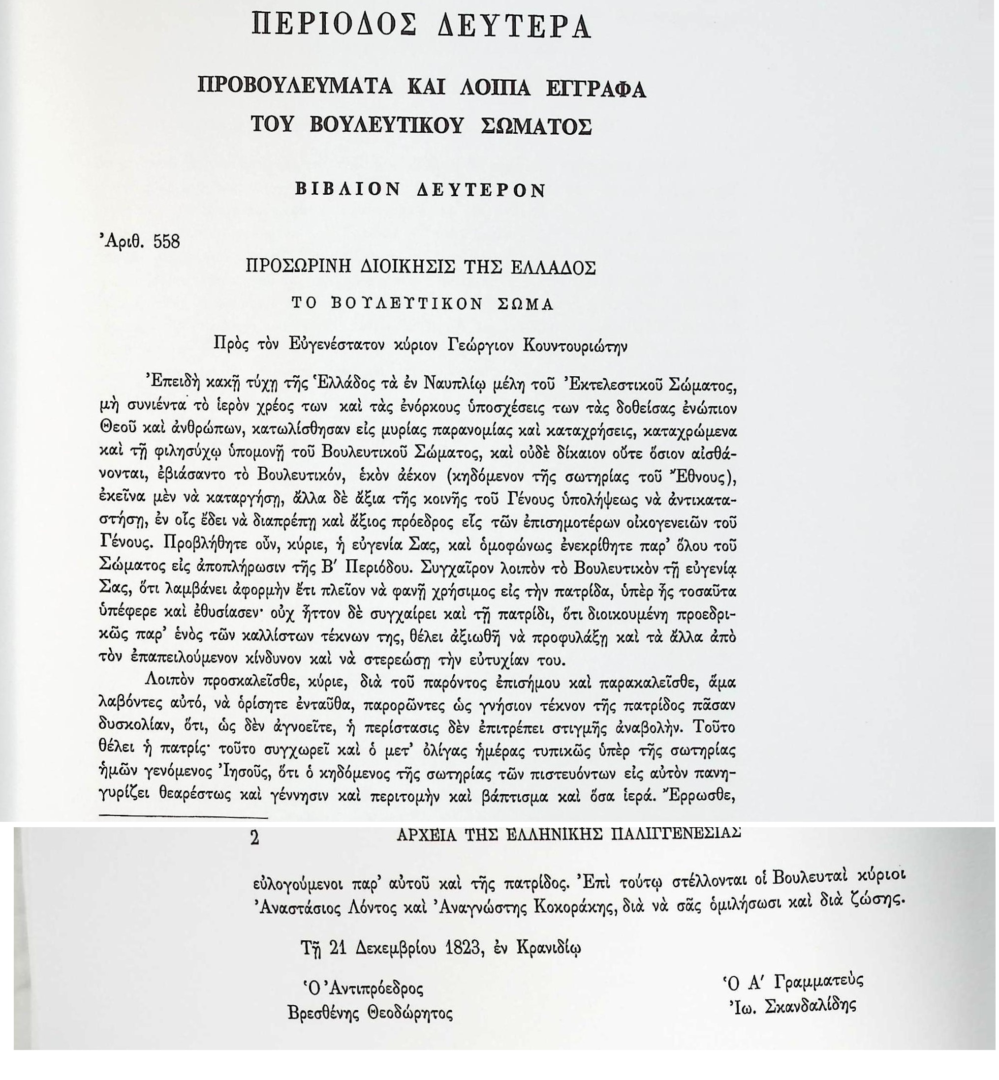 ΑΡΧΕΙΑ ΕΛΛΗΝΙΚΗΣ ΠΑΛΙΓΓΕΝΕΣΙΑΣ, τ.6,αρ.558 Β’ Βουλευτική Περίοδος- Προβουλεύματα & Λοιπά Έγγραφα Βουλευτικού Σώματος , αρ.558, σελ.1 Άγιος Βρεσθένης ΘεοδώρητοςΑναγνώστης ΚοκοράκηςΒουλευτέςΒουλευτικό ΣώμαΓεώργιος ΚουντουριώτηςΕκτελεστικό ΣώμαΕλλάδαΙω.ΣκανδαλίδηςΚρανίδιΝαύπλιοΠροσωρινή ΔιοίκησηΣτρατηγός Αναστάσιος Λόντος