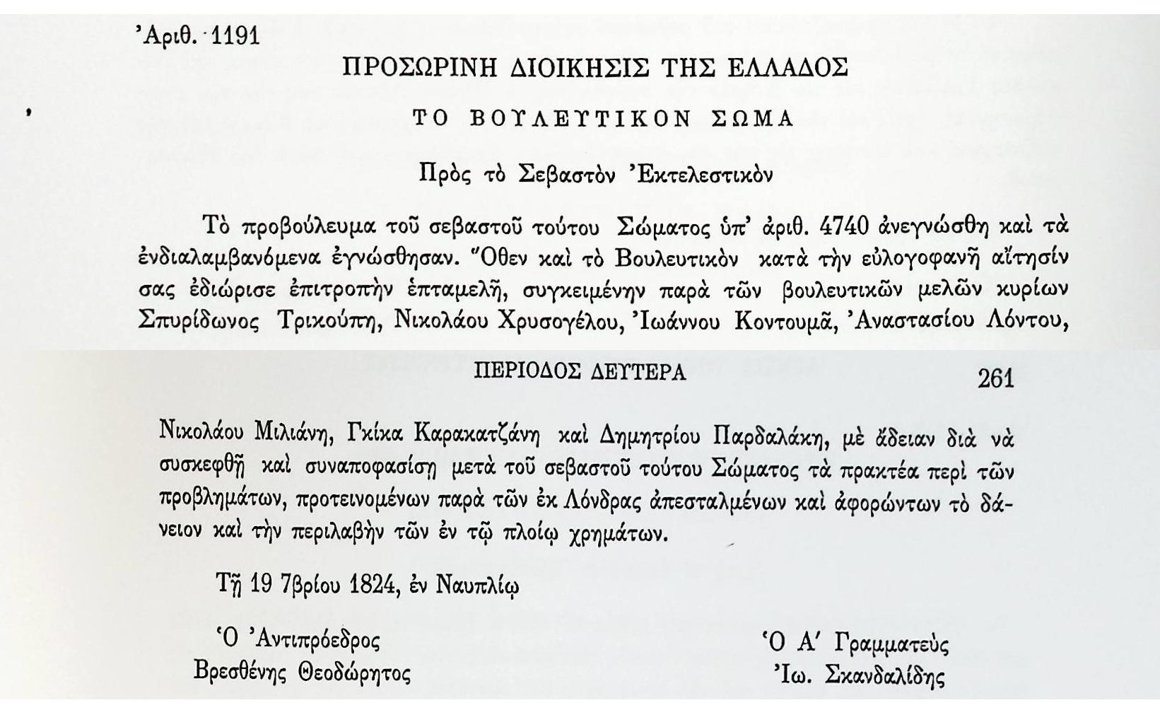 ΑΡΧΕΙΑ ΕΛΛΗΝΙΚΗΣ ΠΑΛΙΓΓΕΝΕΣΙΑΣ, τ.6, αρ.1191 Β’ Βουλευτική Περίοδος- Προβουλεύματα & Λοιπά Έγγραφα Βουλευτικού Σώματος , αρ.1191, σελ.260-Σχετικά με την Επιτροπή του δανείου από το Λονδίνο. Άγιος Βρεσθένης ΘεοδώρητοςΒουλευτικό ΣώμαΔάνειοΔημ.ΠαρδαλάκηςΕκτελεστικό ΣώμαΕλλάδαΙω.ΣκανδαλίδηςΙωάννης ΚοντουμάςΛονδίνοΝαύπλιοΝικόλ. ΜηλιάνηςΝικόλαος ΧρυσόγελοςΠροσωρινή ΔιοίκησηΣπυρίδων ΤρικούπηςΣτρατηγός Αναστάσιος Λόντος