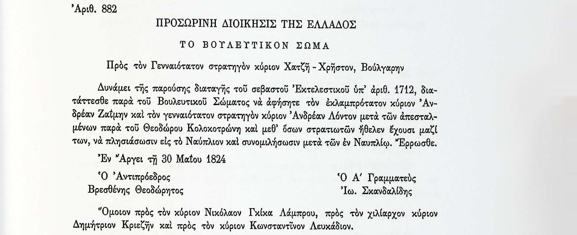 ΑΡΧΕΙΑ ΕΛΛΗΝΙΚΗΣ ΠΑΛΙΓΓΕΝΕΣΙΑΣ, τ.6,αρ.882 Β’ Βουλευτική Περίοδος- Προβουλεύματα & Λοιπά Έγγραφα Βουλευτικού Σώματος , αρ.882, σελ.139 Α.Δ. ΖαΐμηςΒουλευτικό ΣώμαΔ.ΚριεζήςΕκτελεστικό ΣώμαΕλλάδαΘ.ΚολοκοτρώνηςΚωνσταντίνος ΛευκάδιοςΝαύπλιοΝικόλαος Γκίκας ΛάμπρουΠροσωρινή ΔιοίκησηΣτρατηγός Ανδρέας ΛόντοςΣτρατηγός Χατζη-Χρήστος ΒούλγαρηςΦρούρια