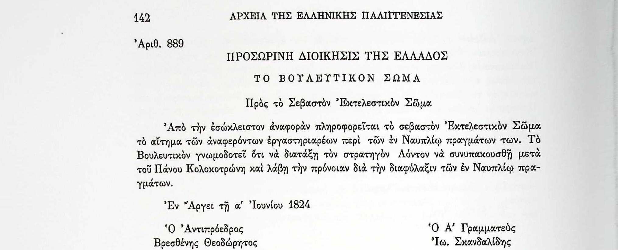 ΑΡΧΕΙΑ ΕΛΛΗΝΙΚΗΣ ΠΑΛΙΓΓΕΝΕΣΙΑΣ, τ.6, αρ.889 Β’ Βουλευτική Περίοδος- Προβουλεύματα & Λοιπά Έγγραφα Βουλευτικού Σώματος , αρ.889, σελ.142 Άγιος Βρεσθένης ΘεοδώρητοςΆργοςΒουλευτικό ΣώμαΕκτελεστικό ΣώμαΕλλάδαΕργαστήριαΙω.ΣκανδαλίδηςΝαύπλιοΠάνος Θ. ΚολοκοτρώνηςΠροσωρινή ΔιοίκησηΣτρατηγός Ανδρέας Λόντος