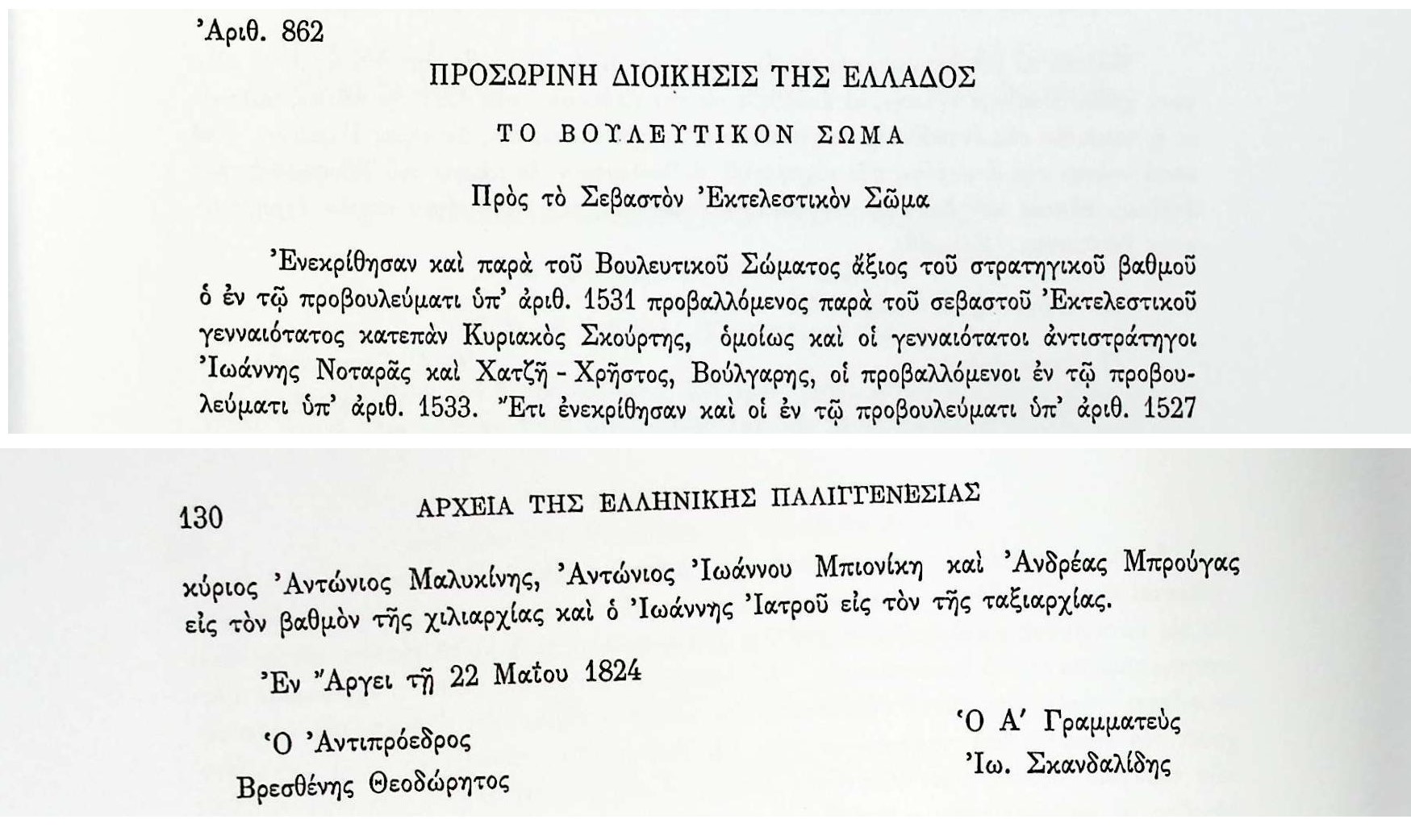 ΑΡΧΕΙΑ ΕΛΛΗΝΙΚΗΣ ΠΑΛΙΓΓΕΝΕΣΙΑΣ, τ.6, αρ.862. Β’ Βουλευτική Περίοδος- Προβουλεύματα & Λοιπά Έγγραφα Βουλευτικού Σώματος , αρ.862, σελ.129-Έγκριση στρατιωτικού βαθμού στον Ιωάννη Νοταρά. Άγιος Βρεσθένης ΘεοδώρητοςΑνδρέας ΜπρούγαςΑντώνιος Ιωάννου ΜπιονίκηςΑντώνιος ΜαλικίνηςΆργοςΒουλευτικό ΣώμαΕλλάδαΙω.ΣκανδαλίδηςΙωάννης ΙατρούΙωάννης ΝοταράςΚυριάκος ΣκούρτηςΠροσωρινή ΔιοίκησηΣτρατηγός Χατζη-Χρήστος Βούλγαρης