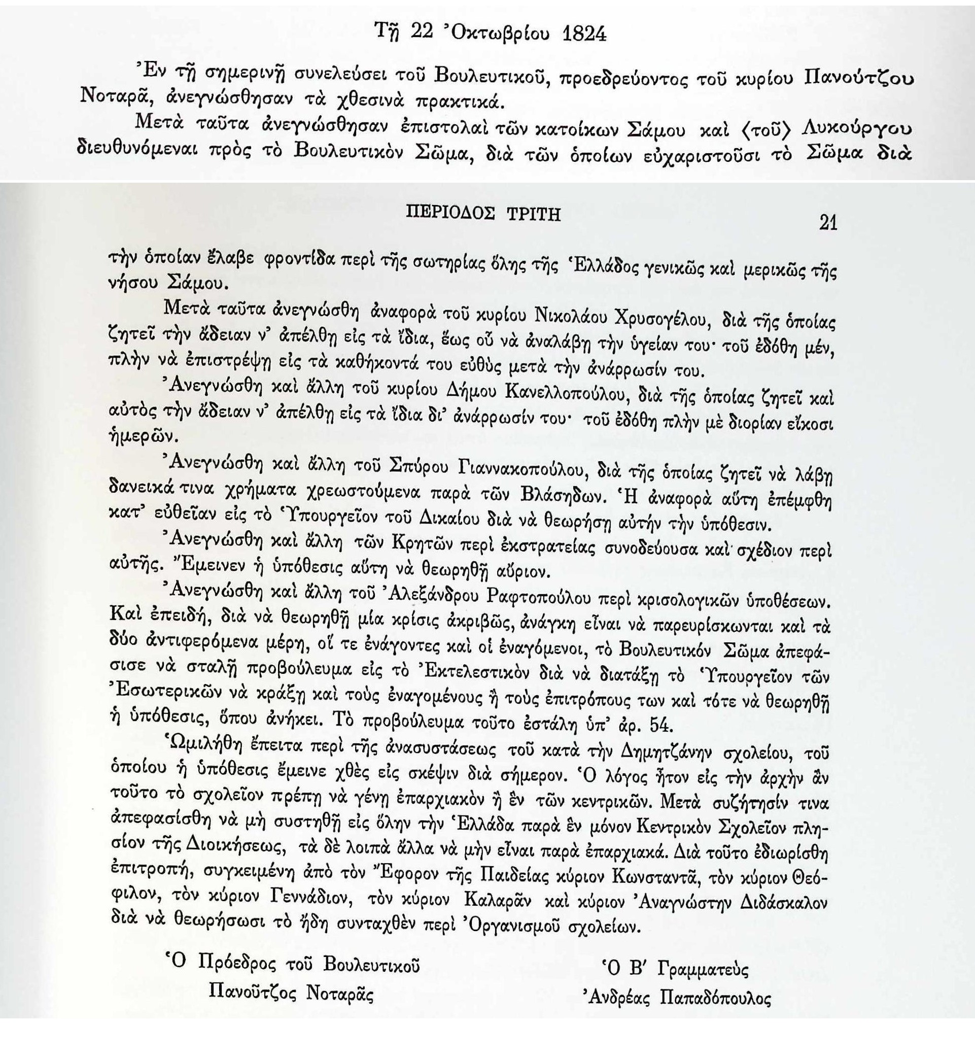 ΑΡΧΕΙΑ ΕΛΛΗΝΙΚΗΣ ΠΑΛΙΓΓΕΝΕΣΙΑΣ, τ.7, σελ.20 Πρακτικά τακτικών συνεδριάσεων Βουλευτικού Σώματος Γ’Περιόδου-22 Οκτωβρίου 1824-Περί σχολείου Δημητσάνας. Αναγνώστης ΔιδασκάλουΑνδρέας ΠαπαδόπουλοςΒουλευτικό ΣώμαΓ.ΓεννάδιοςΓεώργιος ΚαλαράςΓρηγόριος ΚωνσταντάςΔημητσάναΕλλάδαΈφορος της ΠαιδείαςΠανούτσος ΝοταράςΣχολείο