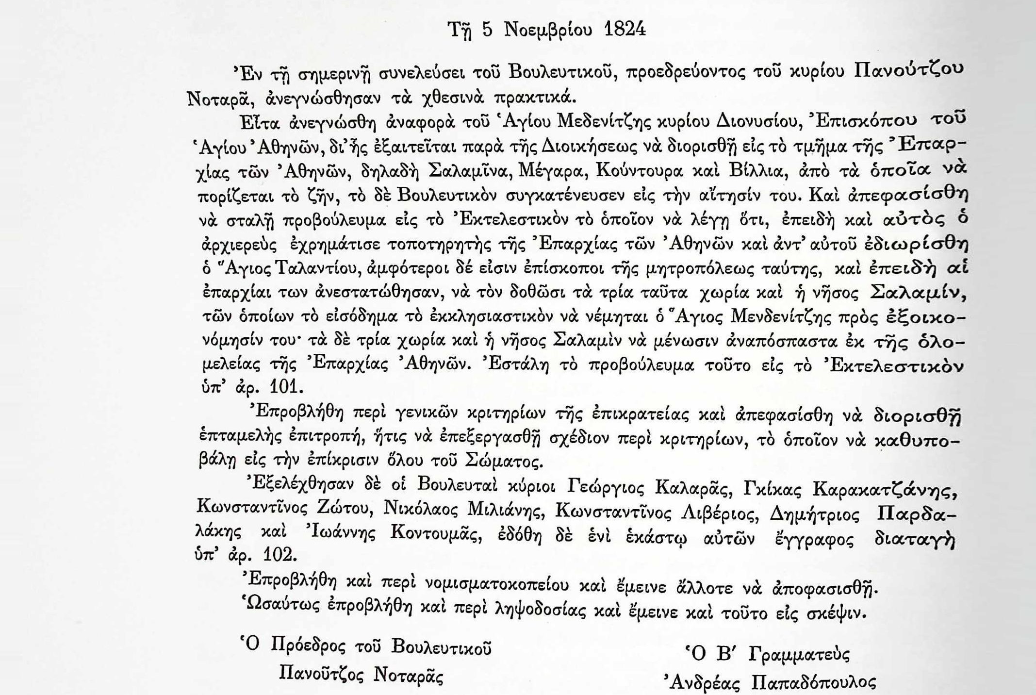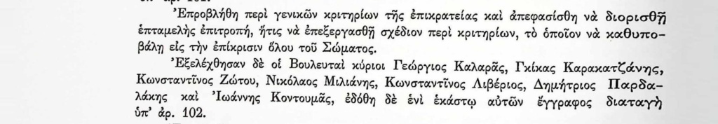 ΑΡΧΕΙΑ ΕΛΛΗΝΙΚΗΣ ΠΑΛΙΓΓΕΝΕΣΙΑΣ, τ.7, σελ.36 Πρακτικά τακτικών συνεδριάσεων Βουλευτικού Σώματος Γ’Περιόδου-5 Νοεμβρίου 1824-Επιτροπή επεξεργασίας γενικών κριτηρίων της Επικράτειας. Βουλευτικό ΣώμαΓεώργιος ΚαλαράςΓκίκας ΚαρακατσάνηςΔημ.ΠαρδαλάκηςΕλλάδαΕπιτροπή ΚριτηρίωνΙωάννης ΚοντουμάςΚωνσταντίνος ΖώτουΚωνσταντίνος ΛιβέριοςΝικόλαος ΜηλιάνηςΠανούτσος Νοταράς