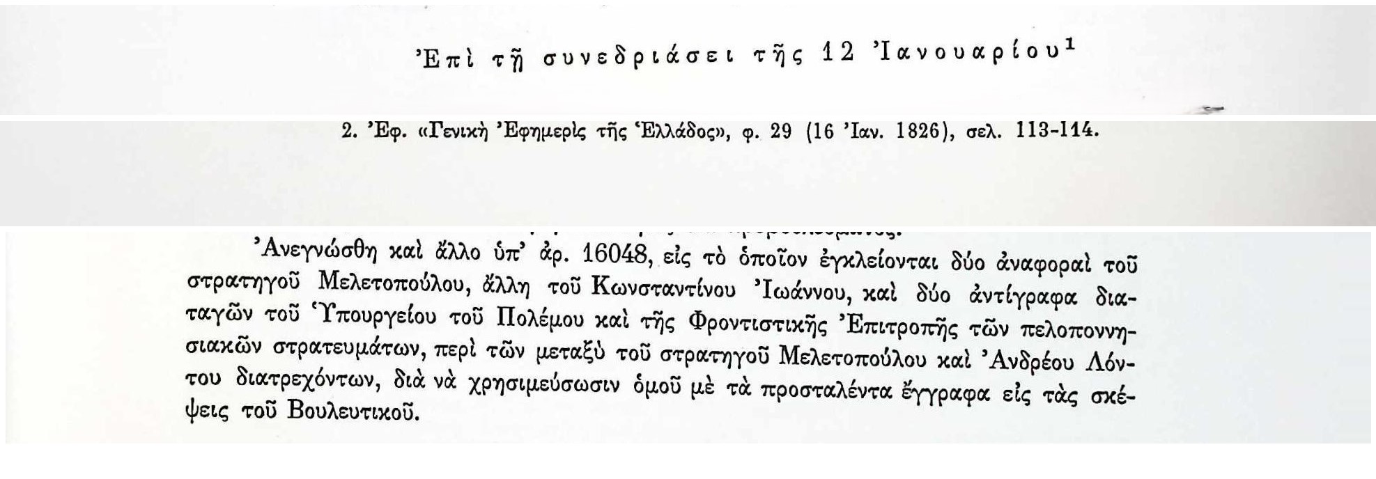 ΑΡΧΕΙΑ ΕΛΛΗΝΙΚΗΣ ΠΑΛΙΓΓΕΝΕΣΙΑΣ, τ.7, σελ.421 Πρακτικά τακτικών συνεδριάσεων Βουλευτικού Σώματος Γ’Περιόδου-12 Ιανουαρίου 1826 Βουλευτικό ΣώμαΔημήτριος ΜελετόπουλοςΕλλάδαΚωνσταντίνος ΙωάννουΠελοπόννησοςΣτρατηγός Ανδρέας ΛόντοςΣτρατός-ΣτρατιώτεςΥπουργείο ΠολέμουΦροντιστική Επιτροπή