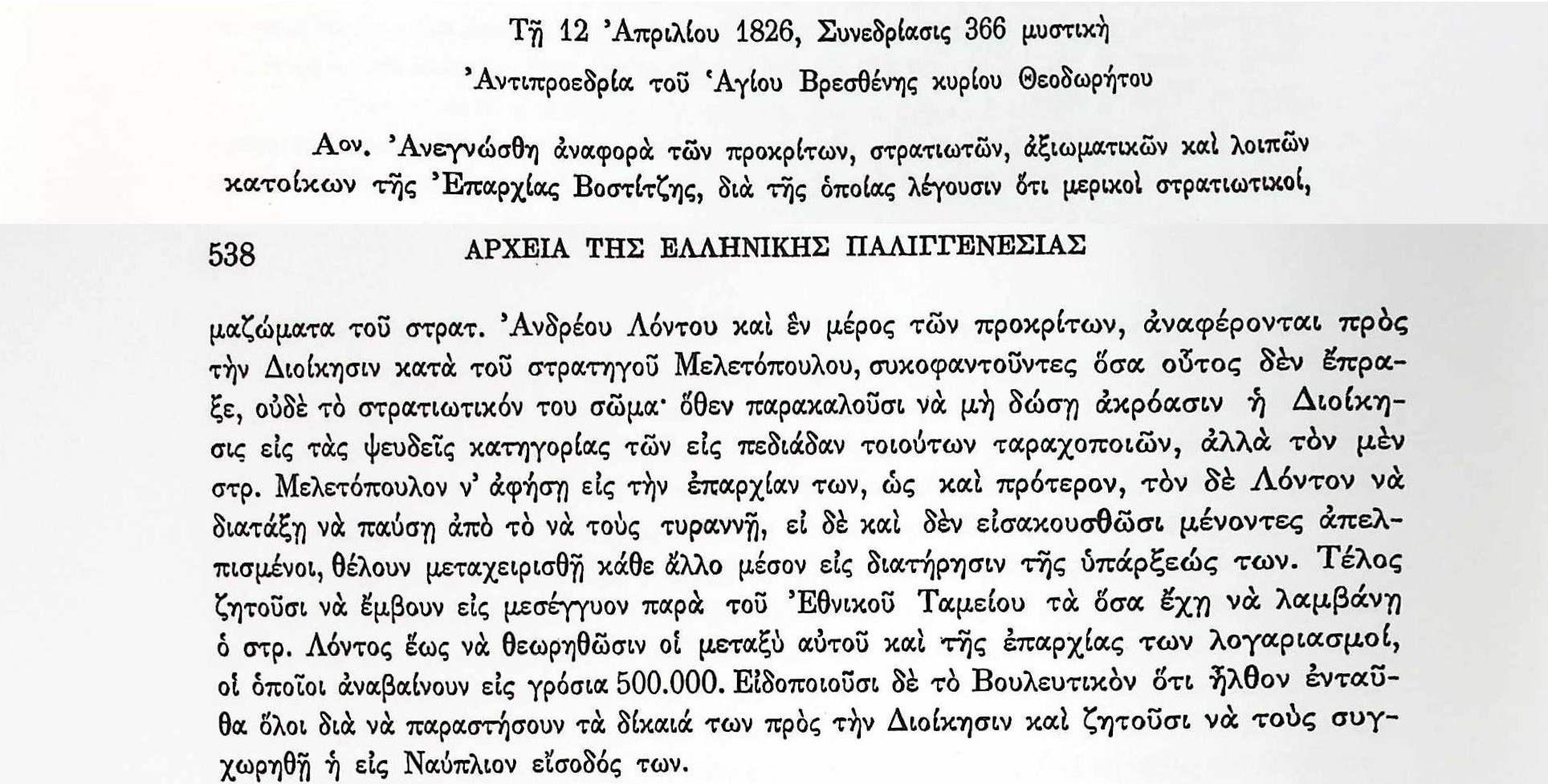 ΑΡΧΕΙΑ ΕΛΛΗΝΙΚΗΣ ΠΑΛΙΓΓΕΝΕΣΙΑΣ, τ.7, σελ.538 Μυστικές Συνεδριάσεις Βουλευτικού Σώματος Γ’Περιόδου-12 Απριλίου 1826-Σχετικά με τον Στρατηγό Ανδρέα Λόντο. Άγιος Βρεσθένης ΘεοδώρητοςΒοστίτσα-ΑίγιοΓρόσιαΔημήτριος ΜελετόπουλοςΕθνικό ΤαμείοΕπαρχίεςΛογαριασμόςΝαύπλιοΣτρατηγός Ανδρέας ΛόντοςΣτρατός-Στρατιώτες