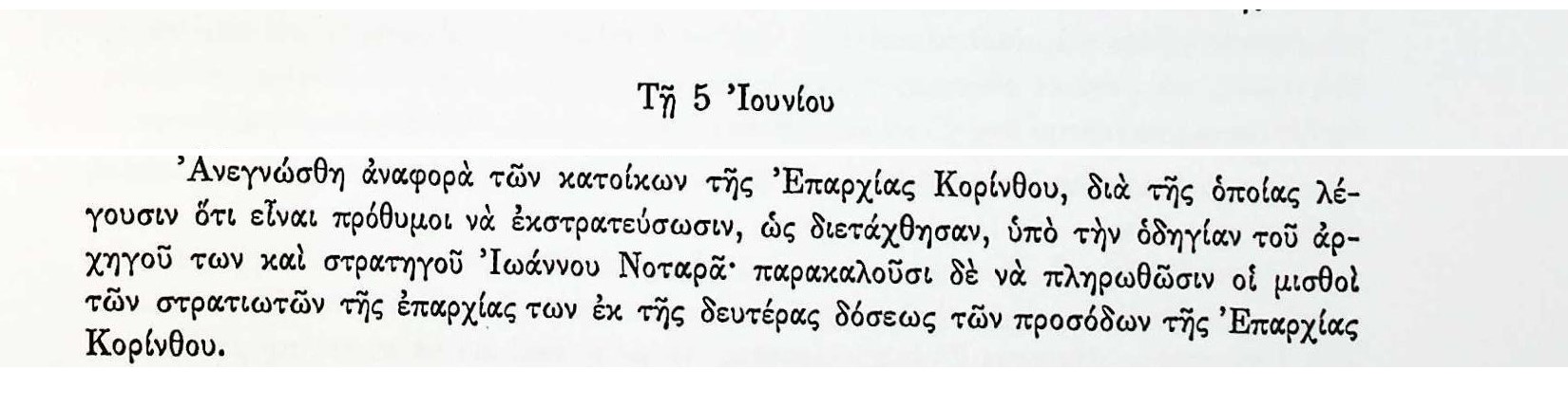 ΑΡΧΕΙΑ ΕΛΛΗΝΙΚΗΣ ΠΑΛΙΓΓΕΝΕΣΙΑΣ, τ.7, σελ.263 Πρακτικά τακτικών συνεδριάσεων Βουλευτικού Σώματος Γ’Περιόδου-05 Ιουνίου 1825-Συμμετοχή των κατοίκων της επαρχίας Κορίνθου στην εκστρατεία, υπό τον Ιωάννη Νοταρά. Βουλευτικό ΣώμαΕκστρατείαΕλλάδαΕπαρχίεςΙωάννης ΝοταράςΚορινθίαΚόρινθοςΜισθοί
