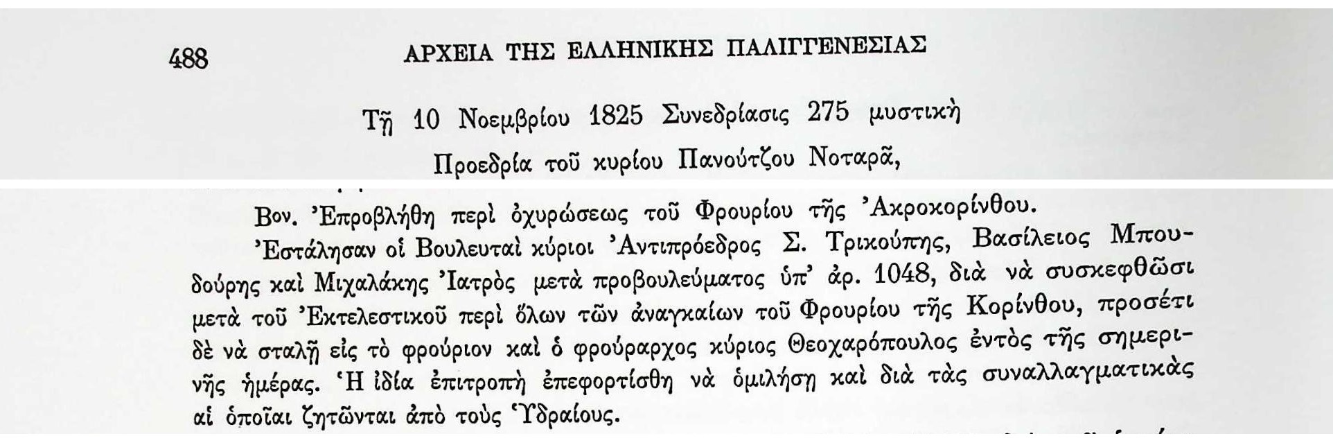 ΑΡΧΕΙΑ ΕΛΛΗΝΙΚΗΣ ΠΑΛΙΓΓΕΝΕΣΙΑΣ, τ.7, σελ.488 Μυστικές Συνεδριάσεις Βουλευτικού Σώματος Γ’ Περιόδου-10 Νοεμβρίου 1825-Συνεδρίαση 275-Σχετικά με την οχύρωση του Φρουρίου της Ακροκορίνθου. ΑκροκόρινθοςΒασίλειος Ν.ΜπουδούρηςΒουλευτέςΒουλευτικό ΣώμαΕκτελεστικό ΣώμαΕλλάδαΚορινθίαΜ.ΙατρόςΝησιάΝησιά Αργοσαρωνικού ΚόλπουΣπυρίδων ΤρικούπηςΣωτήριος ΘεοχαρόπουλοςΎδραΦρούραρχοςΦρούραρχος ΚορίνθουΦρούρια
