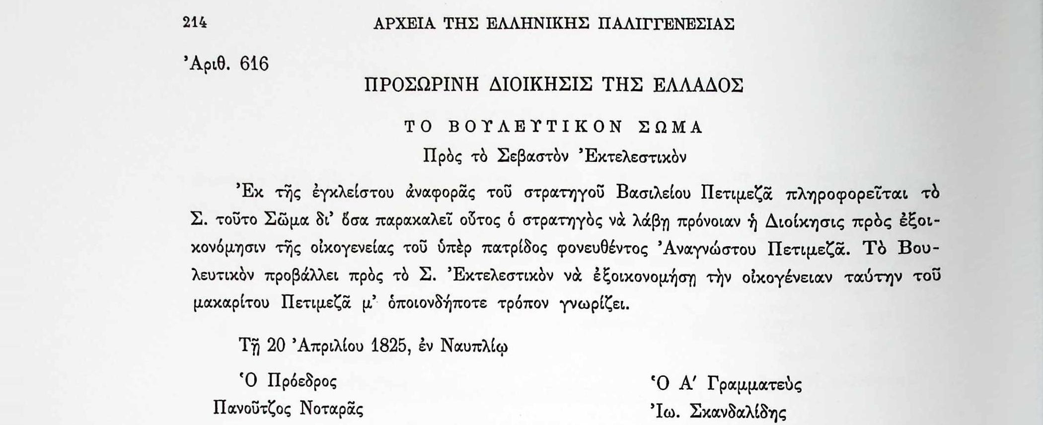 ΑΡΧΕΙΑ ΕΛΛΗΝΙΚΗΣ ΠΑΛΙΓΓΕΝΕΣΙΑΣ, τ.8, σελ.214, αρ.616 Γ’ Βουλευτική Περίοδος 1824-1826, Προβουλεύματα και λοιπά εξερχόμενα έγγραφα του Βουλευτικού Σώματος-Αίτημα για πρόνοια στην οικογένεια του φονευθέντος Αναγνώστη Πετμεζά. Αναγνώστης ΠετμεζάςΒασίλειος ΠετμεζάςΒουλευτικό ΣώμαΕκτελεστικό ΣώμαΕλλάδαΙω.ΣκανδαλίδηςΝαύπλιοΠανούτσος ΝοταράςΠρόνοιαΠροσωρινή Διοίκηση