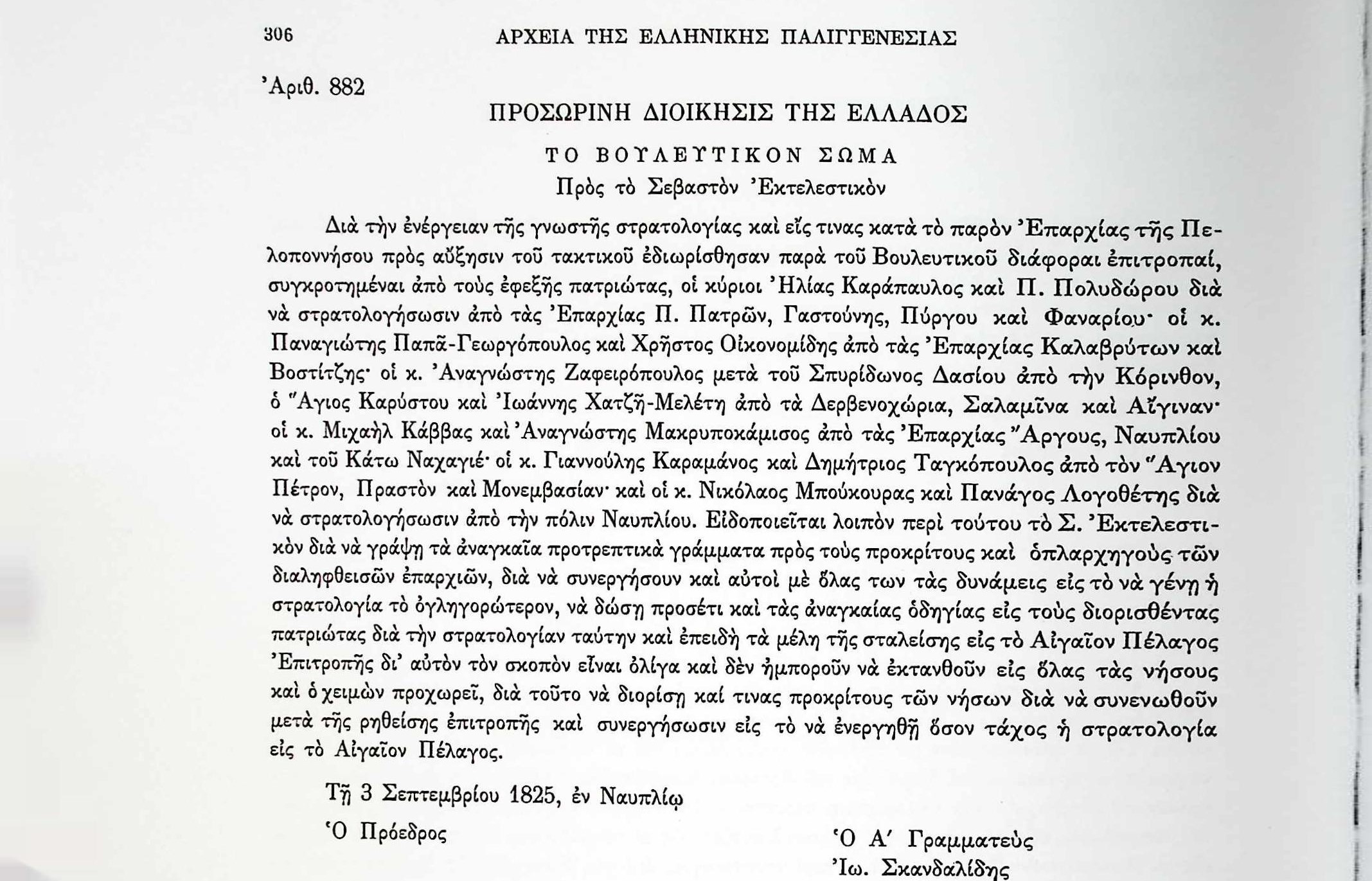 ΑΡΧΕΙΑ ΕΛΛΗΝΙΚΗΣ ΠΑΛΙΓΓΕΝΕΣΙΑΣ, τ.8, σελ.306, αρ.882 Γ’ Βουλευτική Περίοδος 1824-1826, Προβουλεύματα και λοιπά εξερχόμενα έγγραφα του Βουλευτικού Σώματος-Στρατολόγηση στην Πελοπόννησο. Α. ΖαφειρόπουλοςΆγιος ΚαρύστουΆγιος ΠέτροςΑίγιναΑναγν. ΜακρυποκάμισοςΆργοςΒοστίτσα-ΑίγιοΒουλευτικό ΣώμαΓαστούνηΓιαννούλης ΚαραμάνοςΔ. ΤαγκόπουλοςΔερβενοχώριαΔημήτριος ΤαγκόπουλοςΕκτελεστικό ΣώμαΕλλάδαΕπαρχίεςΗλίας ΚαράπαυλοςΙω.ΣκανδαλίδηςΙωάννης ΧατζημελέτηςΚαλάβρυταΚάτω Ναχαγέ.ΚορινθίαΜ.ΚάββαςΜονεμβασιάΝαύπλιοΝικολός ΜπούκουραςοπλαρχηγοίΠ.ΠάτραςΠαναγιωτάκης ΠαπαγεωργόπουλοςΠαναγιώτης ΠολυδώρουΠανάγος ΛογοθέτουΠραστόςΠρόκριτοιΠροσωρινή ΔιοίκησηΠύργοςσαλαμίναΣπυρίδων ΔασίουΣτρατολογίαΦανάριΧρήστος Οικονομίδης