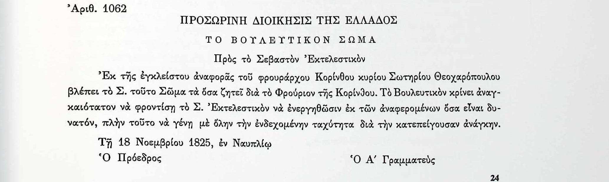 ΑΡΧΕΙΑ ΕΛΛΗΝΙΚΗΣ ΠΑΛΙΓΓΕΝΕΣΙΑΣ, τ.8, σελ.369, αρ.1062 Γ’ Βουλευτική Περίοδος 1824-1826, Προβουλεύματα και λοιπά εξερχόμενα έγγραφα του Βουλευτικού Σώματος-Ανάγκες Φρουρίου Κορίνθου. Βουλευτικό ΣώμαΕλλάδαΚορινθίαΚόρινθοςΝαύπλιοΠροσωρινή ΔιοίκησηΣωτήριος ΘεοχαρόπουλοςΦρούραρχοςΦρούραρχος ΚορίνθουΦρούρια
