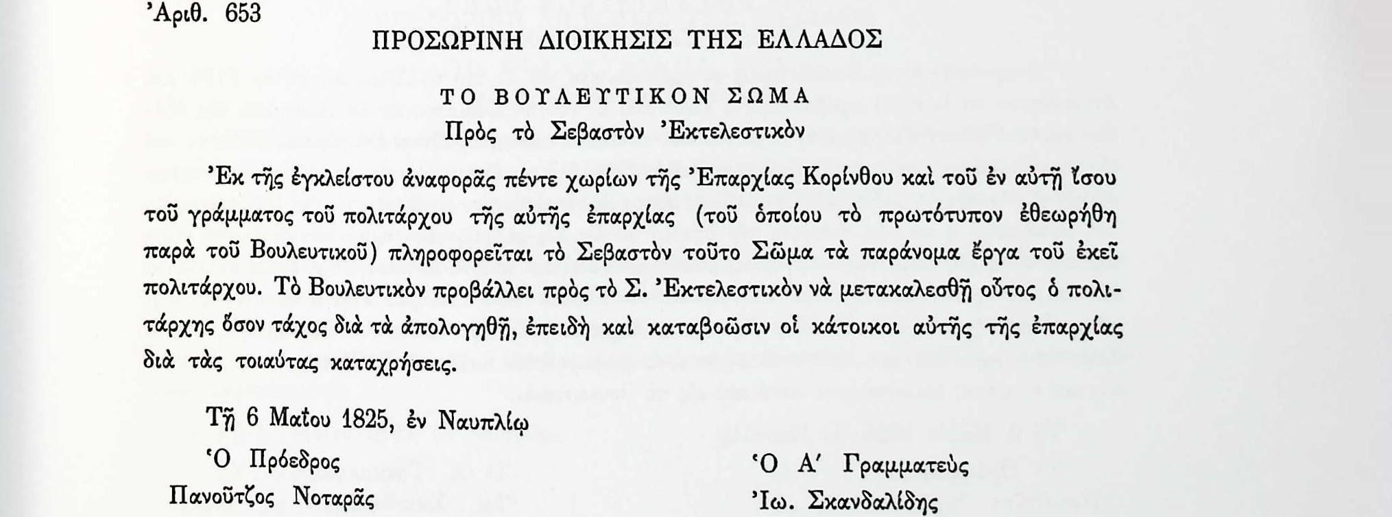 ΑΡΧΕΙΑ ΕΛΛΗΝΙΚΗΣ ΠΑΛΙΓΓΕΝΕΣΙΑΣ, τ.8, σελ.227, αρ.653 Γ’ Βουλευτική Περίοδος 1824-1826, Προβουλεύματα και λοιπά εξερχόμενα έγγραφα του Βουλευτικού Σώματος-Κατηγορίες κατά Πολιτάρχου Κορίνθου. Βουλευτικό ΣώμαΕκτελεστικό ΣώμαΕλλάδαΕπαρχίεςΙω.ΣκανδαλίδηςΚορινθίαΚόρινθοςΝαύπλιοΠανούτσος ΝοταράςΠολιτάρχηςΠροσωρινή Διοίκηση