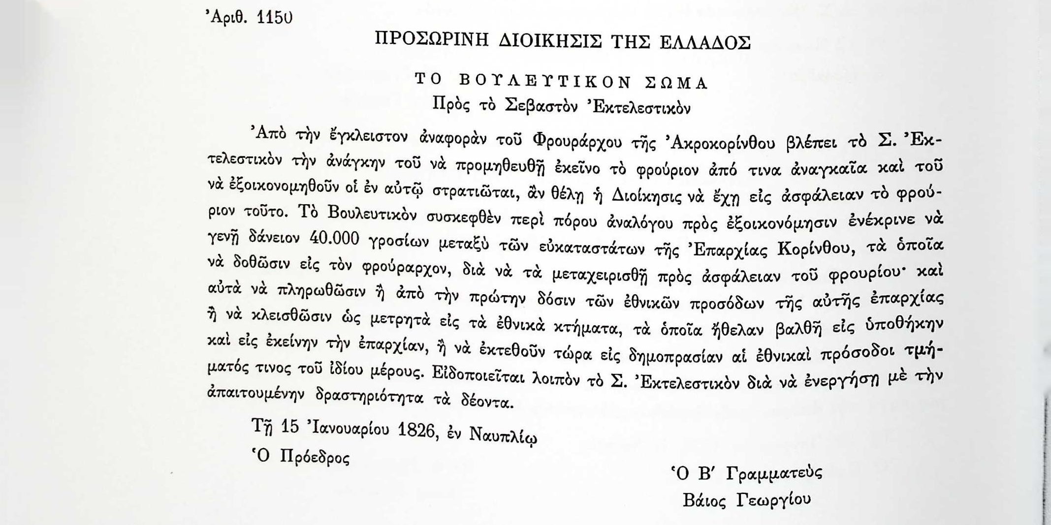 ΑΡΧΕΙΑ ΕΛΛΗΝΙΚΗΣ ΠΑΛΙΓΓΕΝΕΣΙΑΣ, τ.8, σελ.400,αρ.1150 Γ’ Βουλευτική Περίοδος 1824-1826, Προβουλεύματα και λοιπά εξερχόμενα έγγραφα του Βουλευτικού Σώματος-Αναφορά Φρουράρχου Ακροκορίνθου σχετικά με τις ανάγκες του Φρουρίου. ΑκροκόρινθοςΒάιος ΓεωργίουΒουλευτικό ΣώμαΓρόσιαΔάνειοΔημοπρασίαΕκτελεστικό ΣώμαΕλλάδαΕπαρχίεςΚορινθίαΚόρινθοςΝαύπλιοΠρόσοδοιΠροσωρινή ΔιοίκησηΣτρατός-ΣτρατιώτεςΦρούραρχοςΦρούραρχος ΚορίνθουΦρούρια