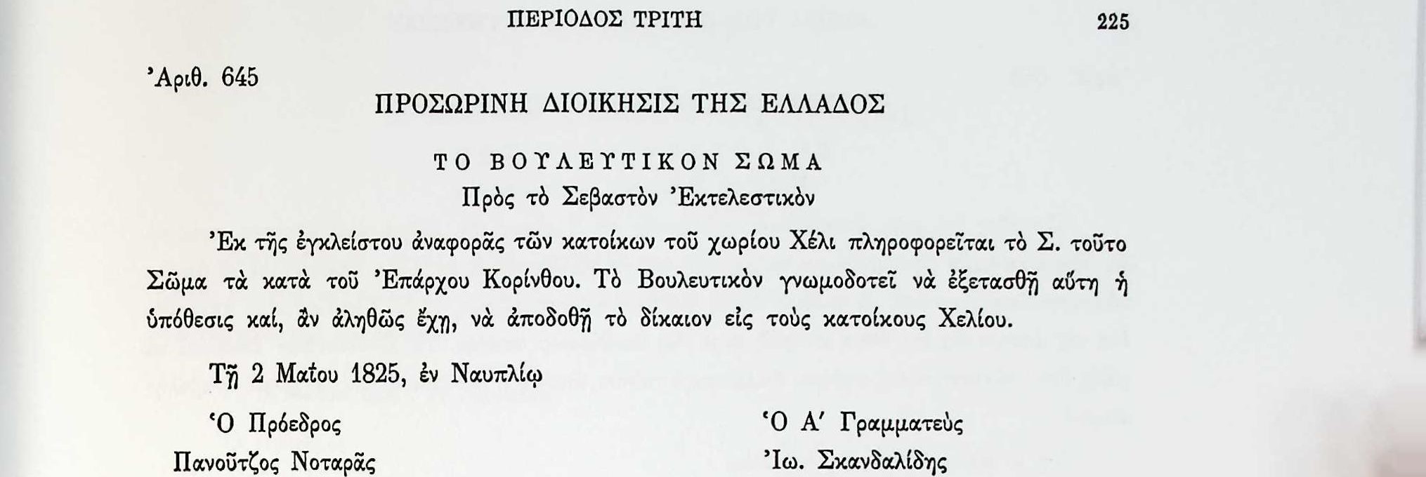 ΑΡΧΕΙΑ ΕΛΛΗΝΙΚΗΣ ΠΑΛΙΓΓΕΝΕΣΙΑΣ, τ.8, σελ.225,αρ.645 Γ’ Βουλευτική Περίοδος 1824-1826, Προβουλεύματα και λοιπά εξερχόμενα έγγραφα του Βουλευτικού Σώματος-Κατηγορίες κατά του Επάρχου Κορίνθου από τους κατοίκους του χωριού Χέλι. Βουλευτικό ΣώμαΕλλάδαΕπαρχίεςΈπαρχοςΈπαρχος ΚορίνθουΙω.ΣκανδαλίδηςΝαύπλιοΠροσωρινή ΔιοίκησηΧέλι