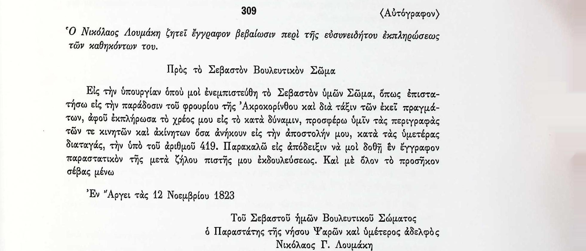 ΑΡΧΕΙΑ ΕΛΛΗΝΙΚΗΣ ΠΑΛΙΓΓΕΝΕΣΙΑΣ, τ.9, σελ.319-αρ.309-12 Νοεμβρίου 1823 «Λυτά Έγγραφα» Α’ & Β’ Βουλευτικής Περιόδου-Αναφορές προς το Βουλευτικό Σώμα-Αίτημα του Ν. Λουμάκη για χορήγηση βεβαίωσης ευσυνείδητης υποχρέωσης καθηκόντων. ΑκροκόρινθοςΆργοςΒουλευτικό ΣώμαΕλλάδαΝικόλαος ΛουμάκηςΠαράδοσηΦρούρια