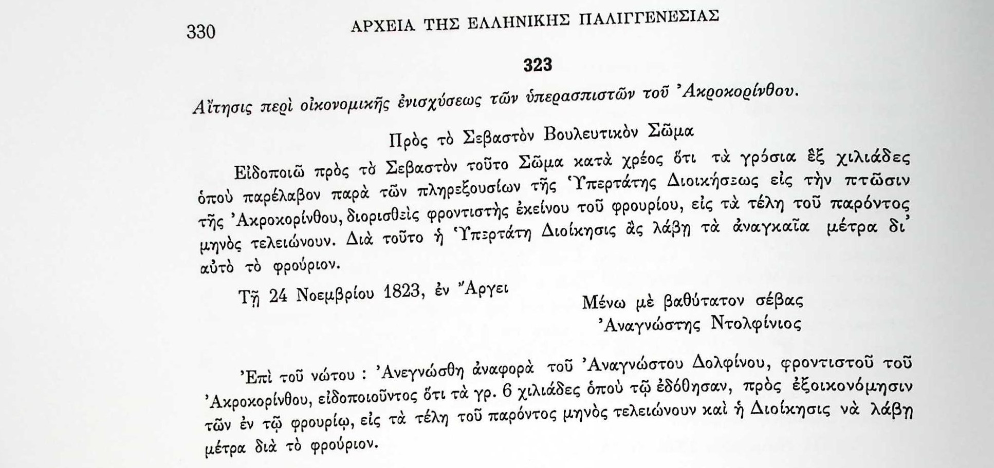 ΑΡΧΕΙΑ ΕΛΛΗΝΙΚΗΣ ΠΑΛΙΓΓΕΝΕΣΙΑΣ, τ.9, σελ.330, αρ.323 «Λυτά Έγγραφα» Α’ & Β’ Βουλευτικής Περιόδου-Αναφορές προς το Βουλευτικό Σώμα, Αίτημα για οικονομική ενίσχυση του Φρουρίου της Ακροκορίνθου. ΑκροκόρινθοςΑναγνώστης ΝτολφίνοςΒουλευτικό ΣώμαΓρόσιαΕκτελεστικό ΣώμαΕλλάδαΠληρεξούσιοιΦροντιστής