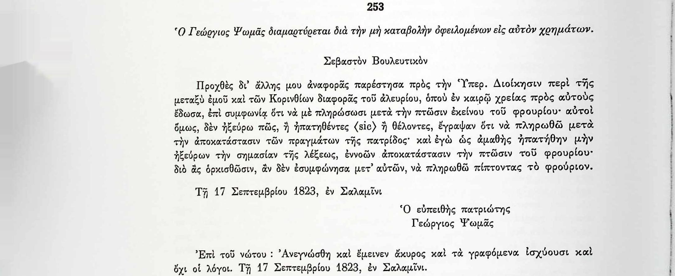 ΑΡΧΕΙΑ ΕΛΛΗΝΙΚΗΣ ΠΑΛΙΓΓΕΝΕΣΙΑΣ, τ.9, σελ.270, αρ.253 «Λυτά Έγγραφα» Α’ & Β’ Βουλευτικής Περιόδου-Αναφορές προς Βουλευτικό Σώμα, Σχετικά με οφειλές Κορίνθιων από αγορά άλευρων. Βουλευτικό ΣώμαΓεώργιος ΨωμάςΕλλάδαΚορινθίαΚόρινθοςσαλαμίνα