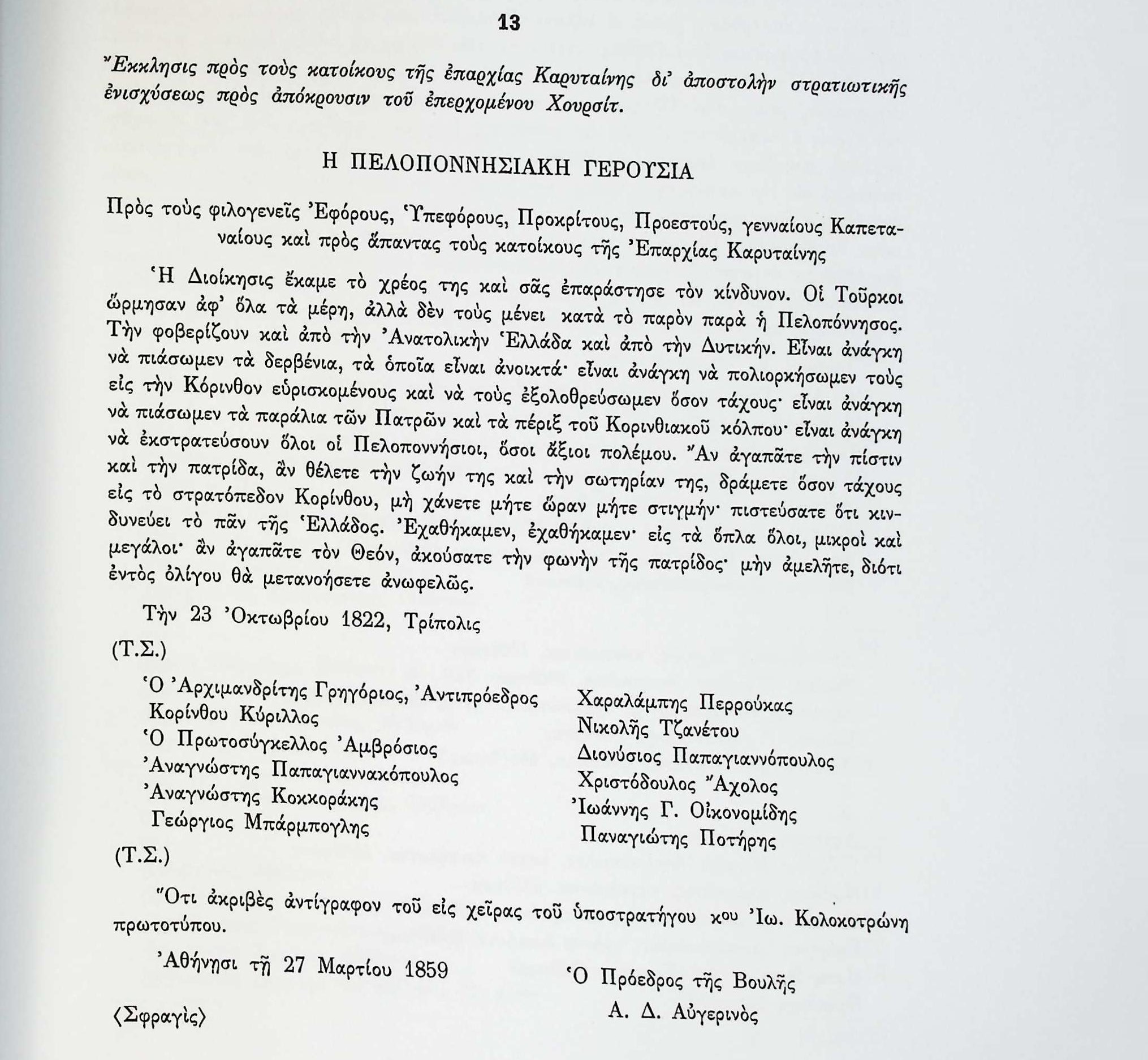 ΑΡΧΕΙΑ ΕΛΛΗΝΙΚΗΣ ΠΑΛΙΓΓΕΝΕΣΙΑΣ, τ.9, σελ.11, αρ.13 «Λυτά Έγγραφα» Α’ & Β’ Βουλευτικής Περιόδου-Έγγραφα Πελοποννησιακής Γερουσίας, Κάλεσμα για συγκέντρωση στρατιωτών στο Στρατόπεδο Κορίνθου προς αντιμετώπιση των στρατευμάτων του Χουρσίτ. Α.Δ.ΑυγερινόςΑθήναΑμβρόσιοςΑν. ΠαπαγιαννακόπουλοςΑναγνώστης ΚοκκοράκηςΑνατολική ΕλλάδαΑρχιερεύς Κύριλλος ΚορίνθουΒουλευτικό ΣώμαΓεώργ.ΜπάρμπογλουΓεώργιος ΜπάρμπογλουΔιονύσιος ΠαπαγιαννόπουλοςΕλλάδαΕπαρχίεςΙωάννης ΚολοκοτρώνηςΙωάννης ΟικονομίδηςΚαρύταιναΚορινθίαΚορινθιακός κόλποςΚόρινθοςΝικολ.ΤζανέτοςΟθωμανοί-ΤούρκοιΠαναγιώτης ΠοτήρηςΠελοποννησιακή ΓερουσίαΠελοπόννησοςΠροεστοίΤρίποληΧαραλάμπης ΠερρούκαςΧριστόδουλος Άχολος