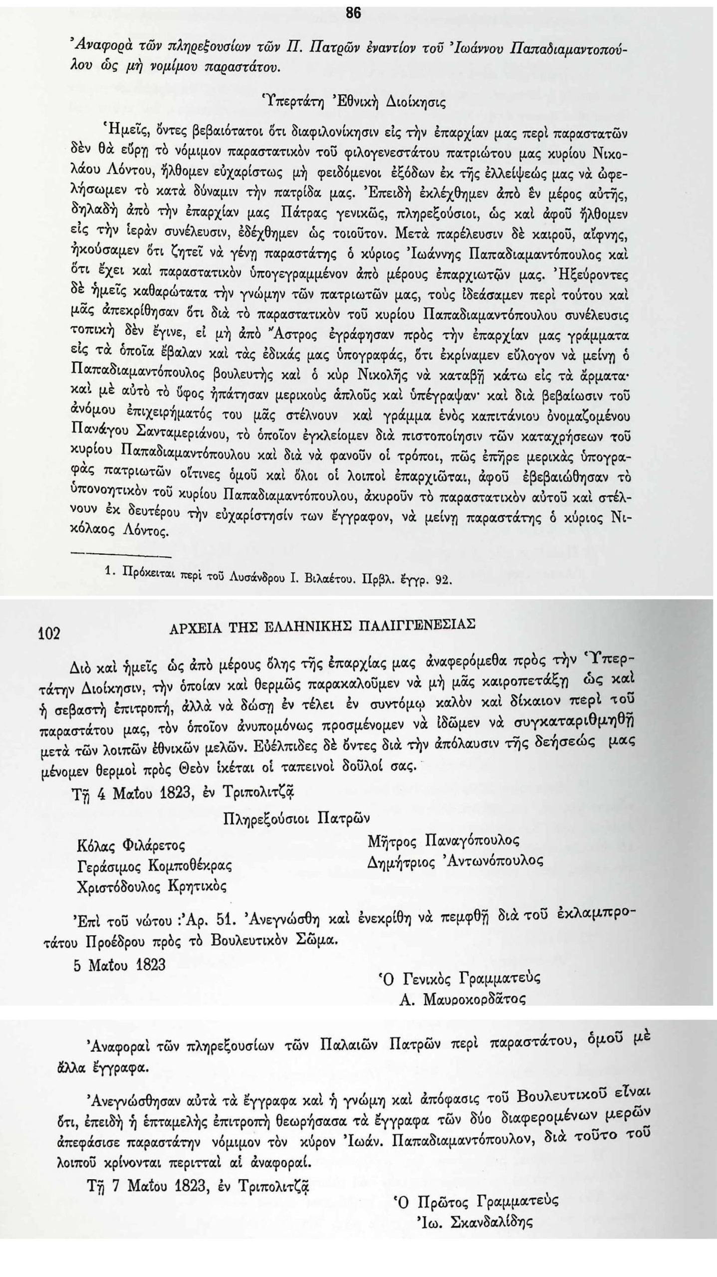 ΑΡΧΕΙΑ ΕΛΛΗΝΙΚΗΣ ΠΑΛΙΓΓΕΝΕΣΙΑΣ, τ.9, σελ.101,αρ.86 «Λυτά Έγγραφα» Α’ & Β’ Βουλευτικής Περιόδου-Εκλογή Βουλευτών-Αναφορά υπέρ Νικολάου Λόντου για την θέση του Παραστάτου της Επαρχίας Πάτρας και δήλωση κατά του Ιωάννη Παπαδιαμαντόπουλου ο οποίος με πλάνη απέσπασε υπογραφές υπέρ του. Αλ.ΜαυροκορδάτοςΆστροςΒουλευτέςΒουλευτικό ΣώμαΓεράσιμος ΚομποθέκραςΔημήτριος ΑντωνόπουλοςΕκτελεστικό ΣώμαΕλλάδαΕπαρχίεςΙωάννης ΠαπαδιαμαντόπουλοςΚόλας ΦιλάρετοςΚορινθίαΚόρινθοςΜήτρος ΠαναγόπουλοςΝικόλαος ΛόντοςΠ.ΠάτραςΠανάγος ΣανταμεριάνοςΠαραστάτεςΠληρεξούσιοιΤρίποληΥπέρτατη ΔιοίκησηΧριστόδουλος Κρητικός