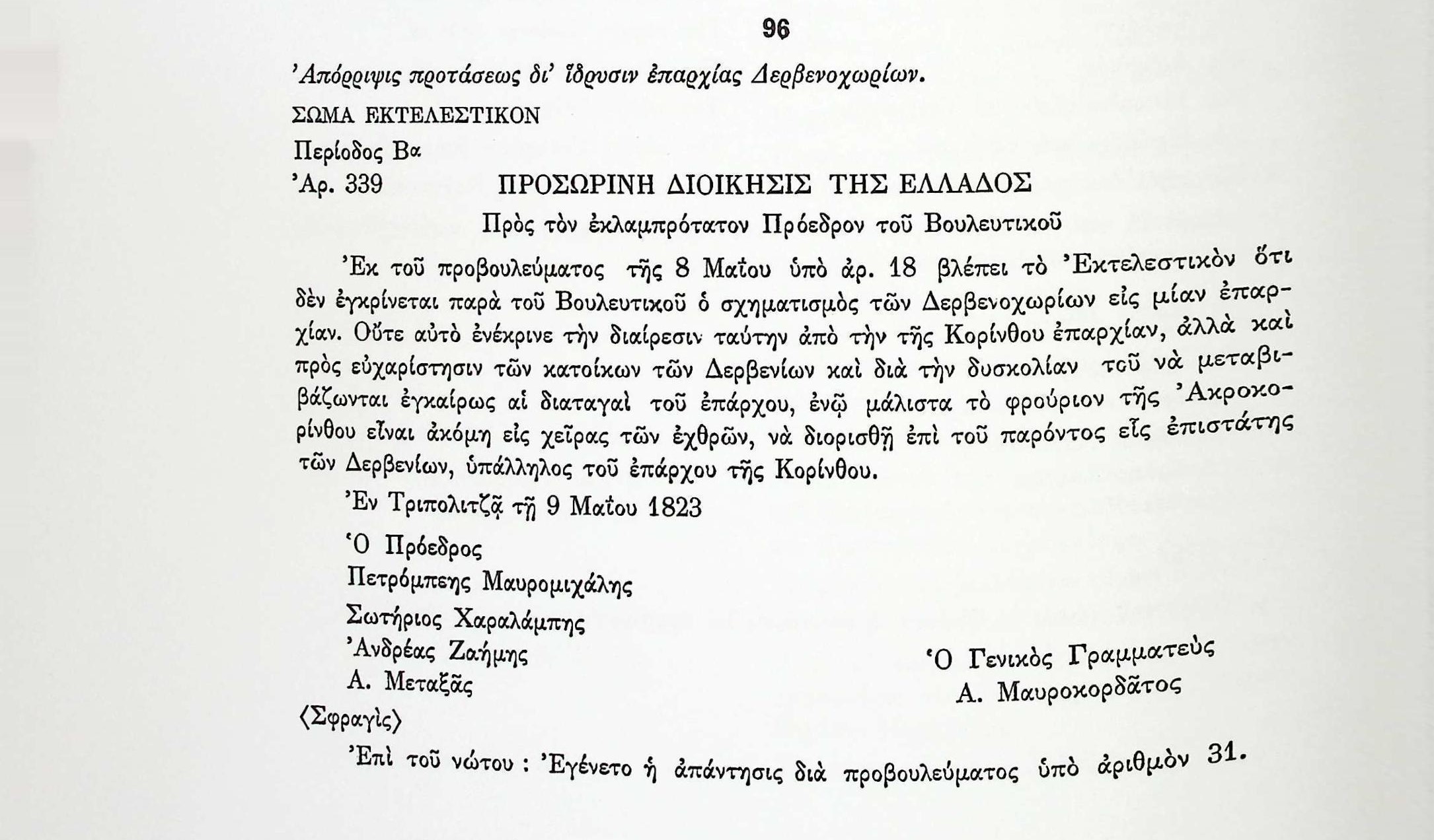 ΑΡΧΕΙΑ ΕΛΛΗΝΙΚΗΣ ΠΑΛΙΓΓΕΝΕΣΙΑΣ, τ.10, σελ.63,αρ.96 «Λυτά Έγγραφα» Α’ & Β’ Βουλευτικής Περιόδου-Έγγραφα Εκτελεστικού Σώματος-Απόρριψη αιτήματος για δημιουργία ξεχωριστής Επαρχίας Δερβενοχωρίων Α. ΜεταξάςΑ.Δ. ΖαΐμηςΑλ.ΜαυροκορδάτοςΒουλευτικό ΣώμαΔερβένιαΔερβενοχώριαΕκτελεστικό ΣώμαΕλλάδαΕπαρχίεςΈπαρχος ΚορίνθουΕπιστάτεςΚορινθίαΚόρινθοςΠ. ΜαυρομιχάληςΠετρόμπεης ΜαυρομιχάληςΣ.ΧαραλάμπηςΤρίποληΦρούρια