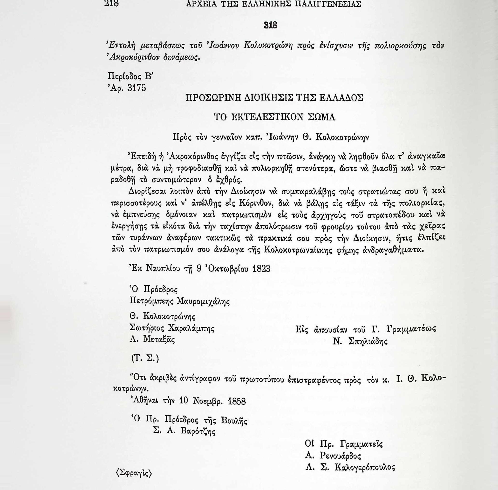 ΑΡΧΕΙΑ ΕΛΛΗΝΙΚΗΣ ΠΑΛΙΓΓΕΝΕΣΙΑΣ, τ.10, σελ.218,αρ.318 «Λυτά Έγγραφα» Α’ & Β’ Βουλευτικής Περιόδου-Έγγραφα Εκτελεστικού Σώματος-Εντολή μετακίνησης του Ιωάννη Κολοκοτρώνη στο Φρούριο της Ακροκορίνθου, προς ενίσχυση του Αγώνα και . Α. ΜεταξάςΑ. ΡενουάρδοςΑκροκόρινθοςΕκτελεστικό ΣώμαΕλλάδαΙωάννης ΚολοκοτρώνηςΚορινθίαΚόρινθοςΛ.Σ. ΚαλογερόπουλοςΝ. ΣπηλιάδηςΝαύπλιοΠ. ΜαυρομιχάληςΠετρόμπεης ΜαυρομιχάληςΠροσωρινή ΔιοίκησηΣ.Α. ΒαρότζηςΣ.ΧαραλάμπηςΣτρατόπεδαΦρούρια