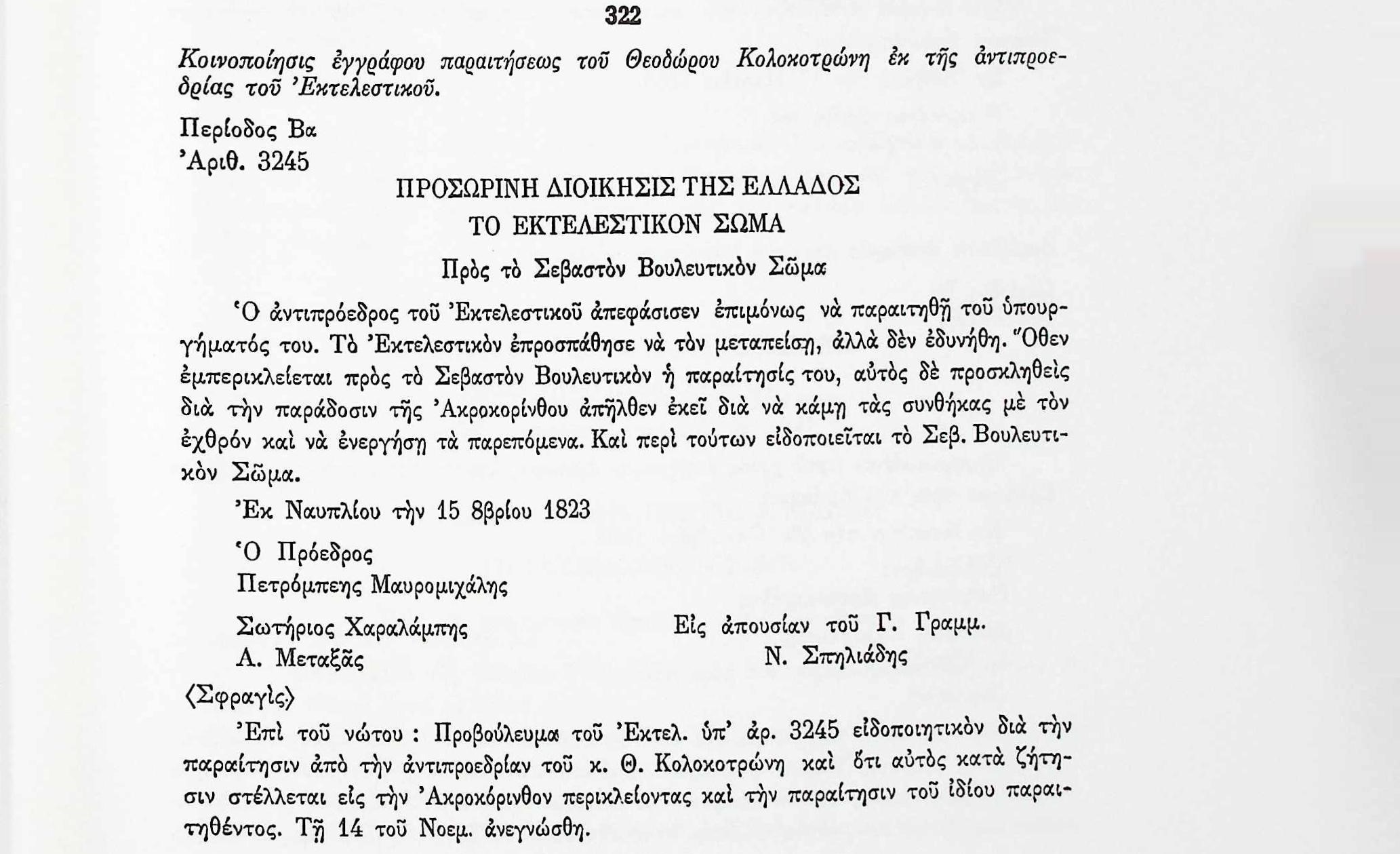 ΑΡΧΕΙΑ ΕΛΛΗΝΙΚΗΣ ΠΑΛΙΓΓΕΝΕΣΙΑΣ, τ.10, σελ.221, αρ.322 «Λυτά Έγγραφα» Α’ & Β’ Βουλευτικής Περιόδου-Έγγραφα Εκτελεστικού Σώματος-Παραίτηση Θεόδωρου Κολοκοτρώνη από την Αντιπροεδρία του Βουλευτικού Σώματος και μετάβασή του στην Κόρινθο για την παράδοση του Φρουρίου της Ακροκορίνθου. Α. ΜεταξάςΑκροκόρινθοςΒουλευτικό ΣώμαΕκτελεστικό ΣώμαΕλλάδαΘ.ΚολοκοτρώνηςΚορινθίαΚόρινθοςΝ. ΣπηλιάδηςΝαύπλιοΠ. ΜαυρομιχάληςΠαράδοσηΠαραίτησηΠετρόμπεης ΜαυρομιχάληςΠροσωρινή Διοίκηση