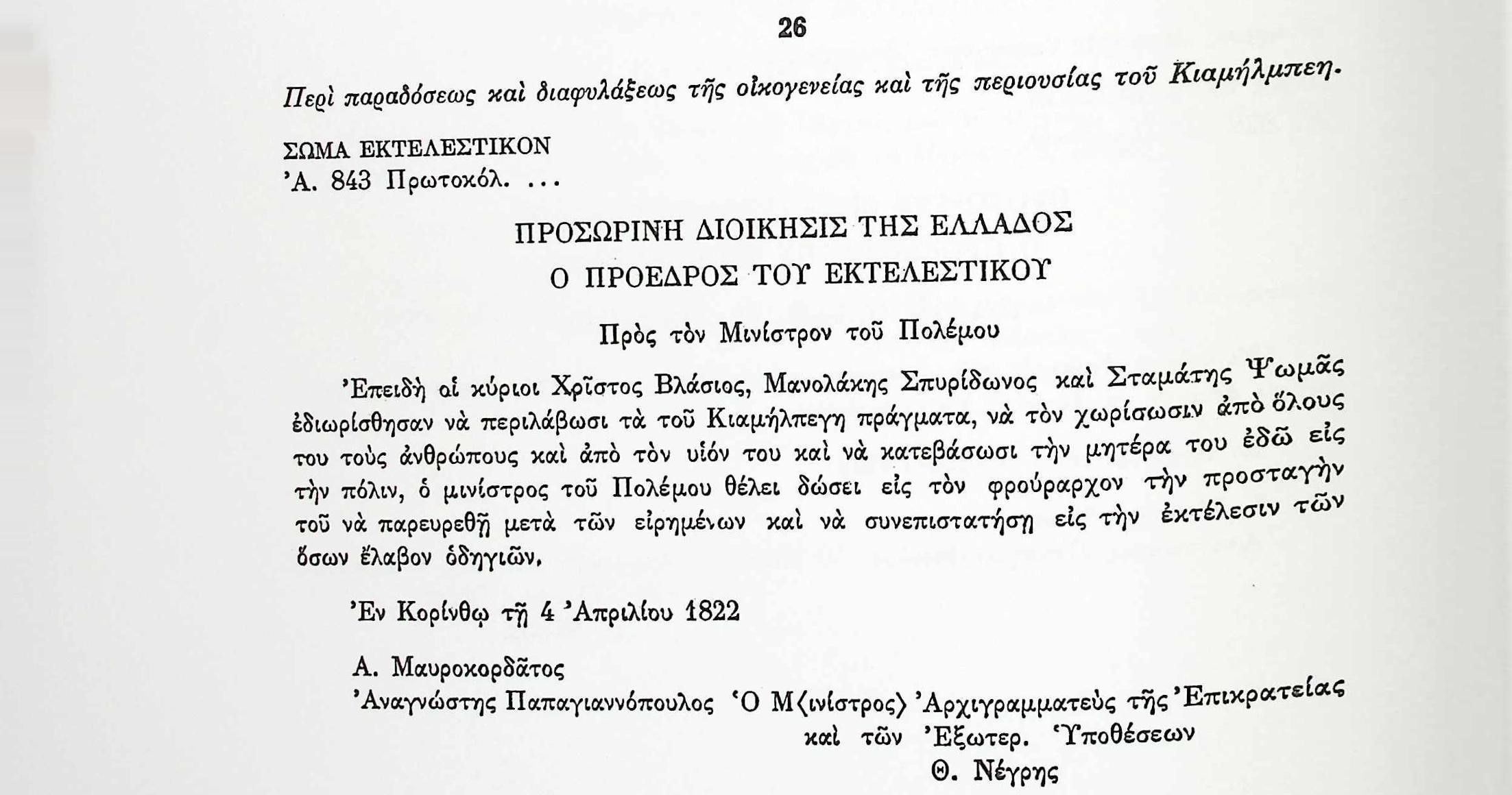 ΑΡΧΕΙΑ ΕΛΛΗΝΙΚΗΣ ΠΑΛΙΓΓΕΝΕΣΙΑΣ, τ.10, σελ.14,αρ.26 «Λυτά Έγγραφα» Α’ & Β’ Βουλευτικής Περιόδου-Έγγραφα Εκτελεστικού Σώματος-Παράδοση και προστασία οικογένειας Κιαμίλ Μπέη. Α.ΠαπαγιαννόπουλοςΕκτελεστικό ΣώμαΕλλάδαΘ.ΝέγρηςΚιαμήλ ΜπέηςΚορινθίαΚόρινθοςΠροσωρινή ΔιοίκησηΣπυρίδων ΜανωλάκηςΣταμάτης ΨωμάςΥπουργείο ΠολέμουΧρίστος Βλάσιος