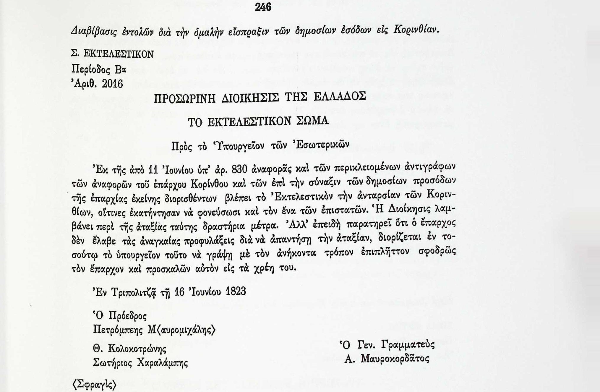 ΑΡΧΕΙΑ ΕΛΛΗΝΙΚΗΣ ΠΑΛΙΓΓΕΝΕΣΙΑΣ, τ.10, σελ.159,αρ.246 «Λυτά Έγγραφα» Α’ & Β’ Βουλευτικής Περιόδου-Έγγραφα Εκτελεστικού Σώματος-Ανταρσία Κορίνθιων και λήψη μέτρων καταστολής και επίπληξη Επάρχου. Αλ.ΜαυροκορδάτοςΕκτελεστικό ΣώμαΕλλάδαΕπαρχίεςΕπιστάτεςΘ.ΚολοκοτρώνηςΚορινθίαΚόρινθοςΠ. ΜαυρομιχάληςΠετρόμπεης ΜαυρομιχάληςΠρόσοδοιΣ.ΧαραλάμπηςΤρίποληΥπουργείο Εσωτερικών