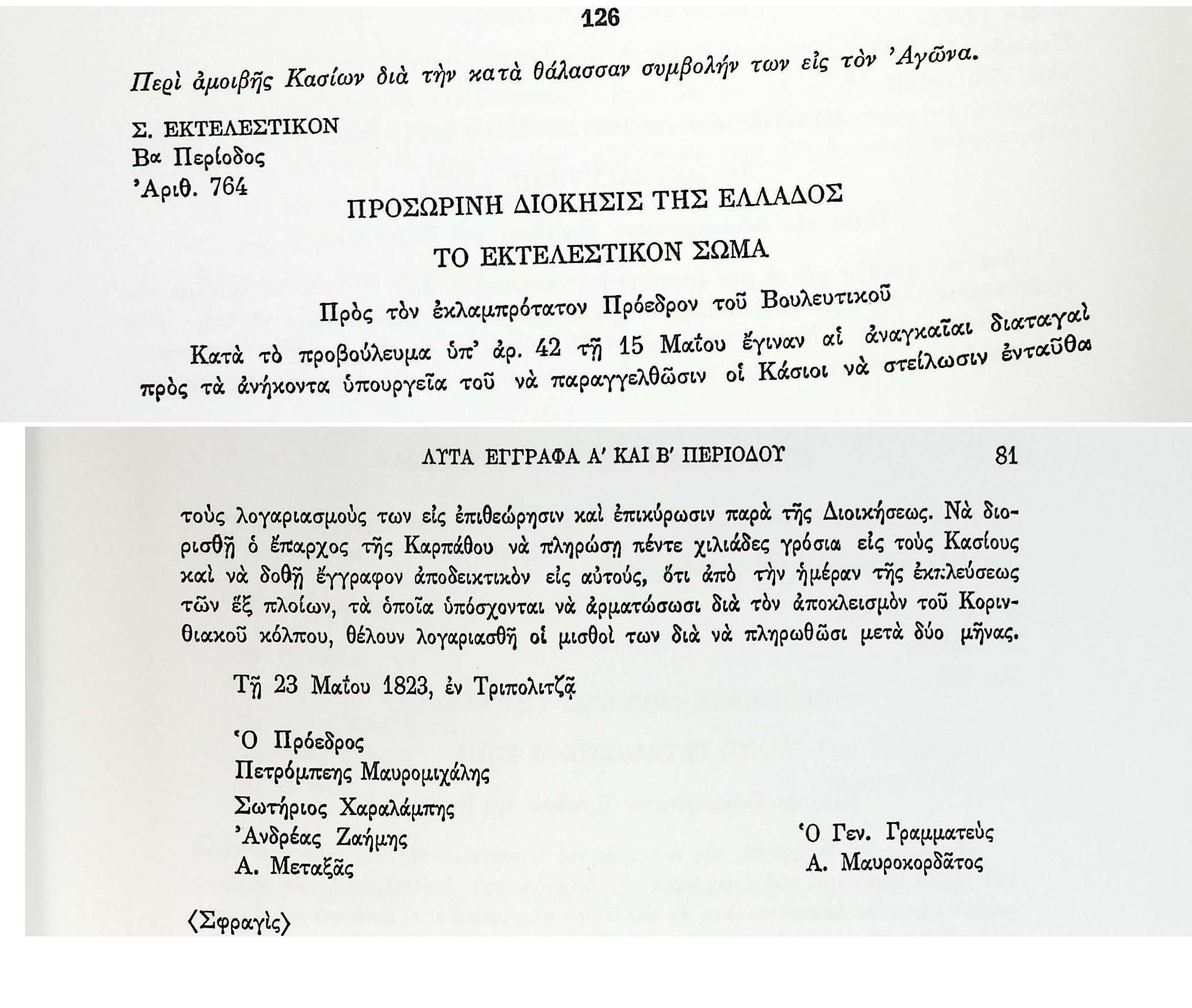 ΑΡΧΕΙΑ ΕΛΛΗΝΙΚΗΣ ΠΑΛΙΓΓΕΝΕΣΙΑΣ, τ.10, σελ.80,αρ.126 «Λυτά Έγγραφα» Α’ & Β’ Βουλευτικής Περιόδου-Έγγραφα Εκτελεστικού Σώματος-Πλοία Κασίων για τον αποκλεισμό του Κορινθιακού κόλπου. Α. ΜεταξάςΑ.Δ. ΖαΐμηςΑλ.ΜαυροκορδάτοςΒουλευτικό ΣώμαΓρόσιαΕκτελεστικό ΣώμαΕλλάδαΙστιοφόραΚάρπαθοςΚάσοςΚορινθιακός κόλποςΜισθοίΠ. ΜαυρομιχάληςΠετρόμπεης ΜαυρομιχάληςπλοίαΠροσωρινή ΔιοίκησηΣ.ΧαραλάμπηςΣκάφη